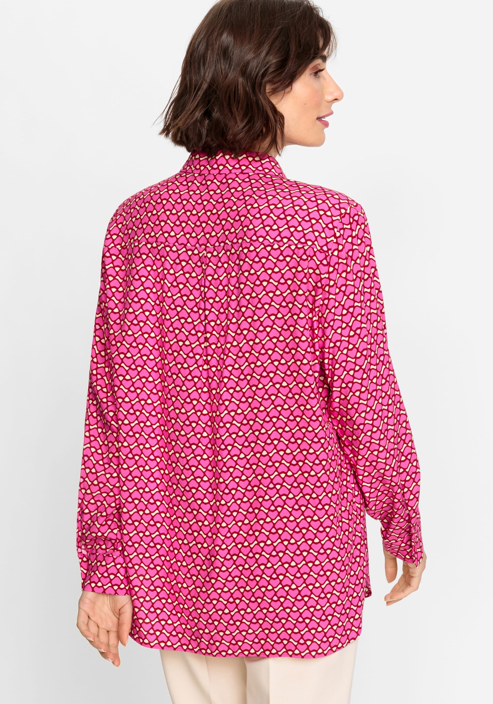 Яркая рубашка с очаровательным узором в виде сердечек по всей поверхности. В нем присутствуют все классические элементы рубашки: отложной воротник, планка на пуговицах спереди, рукава с манжетами и изящная складка посередине спины.