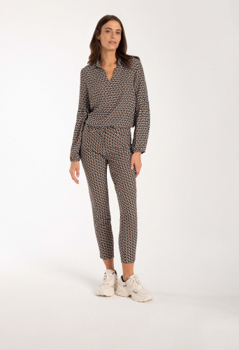 Свободная, струящаяся блузка из вискозы от MORE & MORE с графическим мини-рисунком черного/коричневого/белого цвета идеально сочетается с узкими брюками. Прямая, свободная форма, V-образный вырез с воротником рубашки, длинные рукава со сборками по швам и эластичными концами, графический мини-узор черного/коричневого/белого цвета. Длина по размеру 42 = 68см