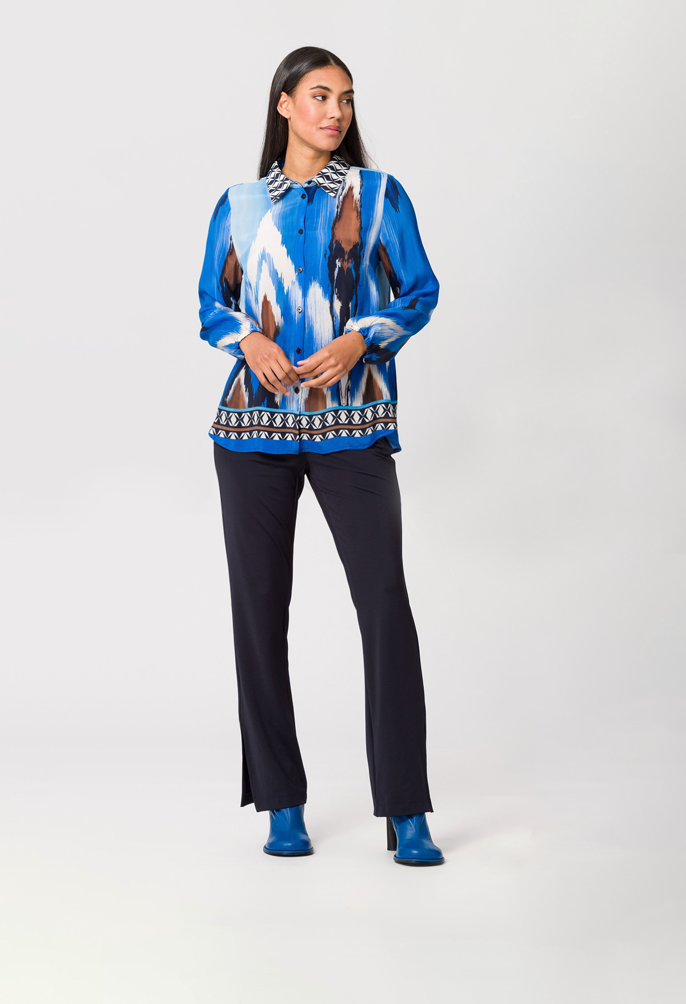 Блузка женская с планкой на пуговицах. Эта облегающая фигура модель из шелковистой ткани купро определенно подойдет для непринужденного делового гардероба и гардероба для отдыха. Удивительно изысканно: воротник блузки с контрастным рисунком и сильно закругленный подол блузки с соответствующим принтом по кайме.