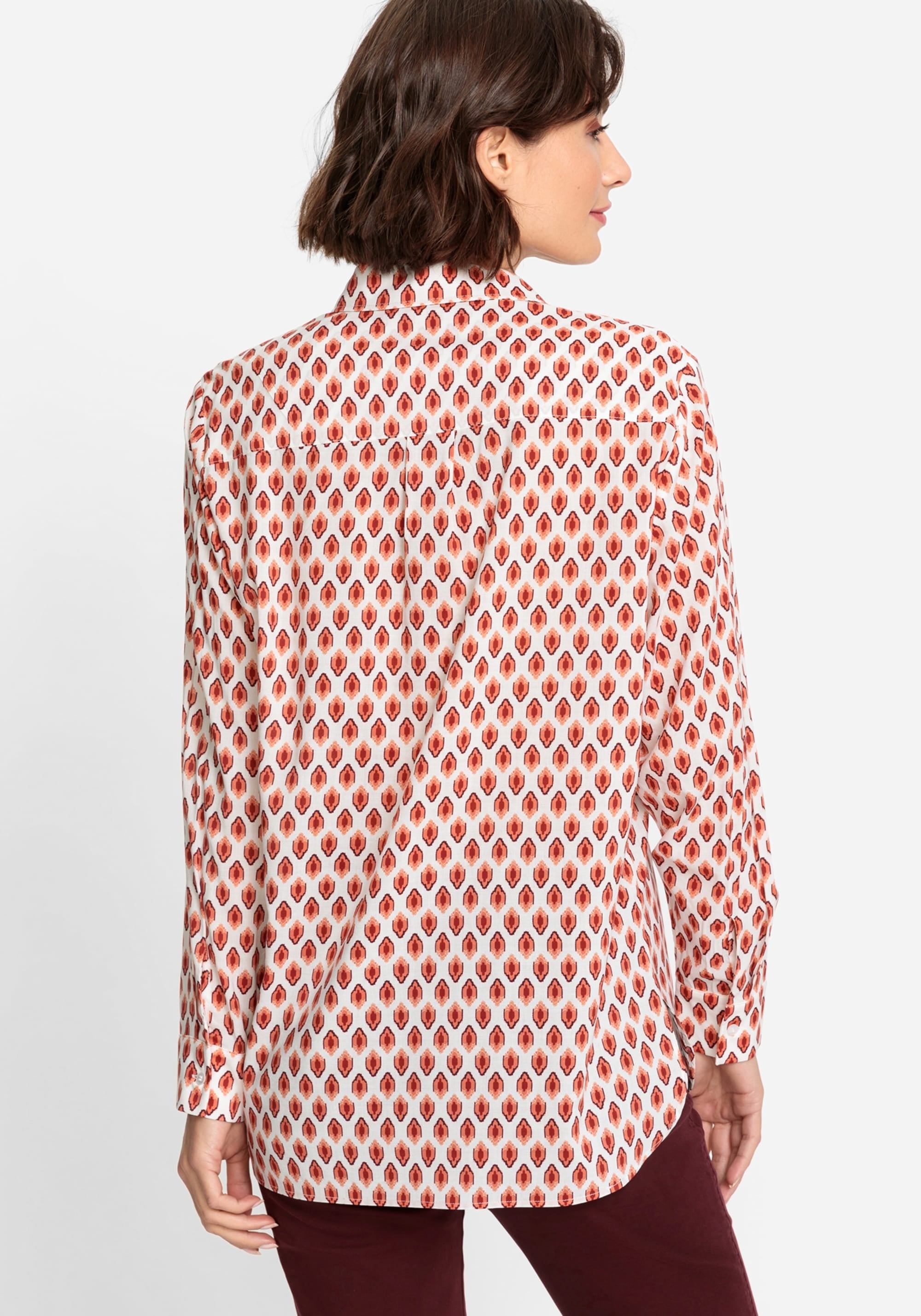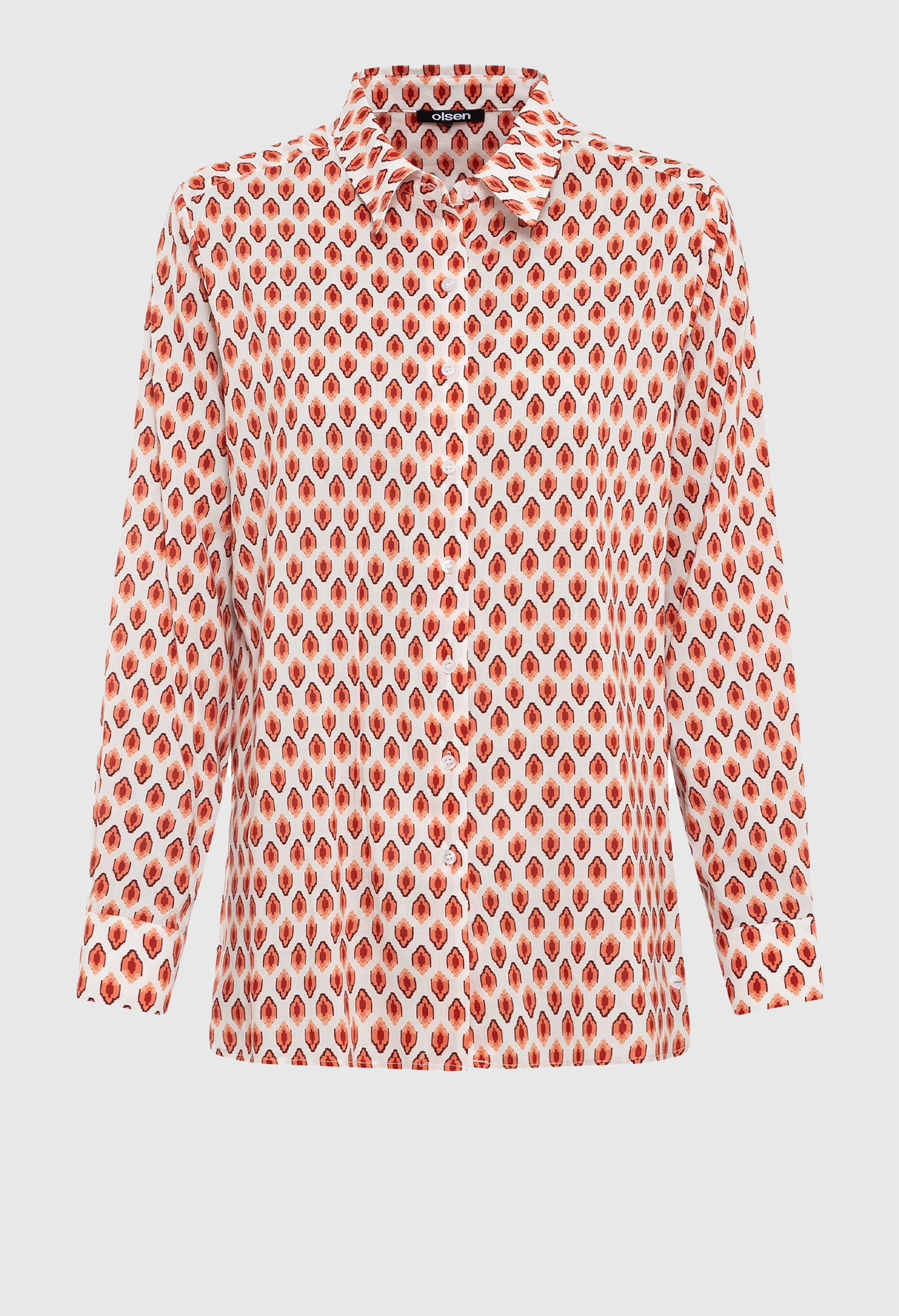 Классическая рубашка с эффектным геометрическим узором по всей поверхности в теплых осенних тонах. Отложной воротник, планка на пуговицах спереди, пуговицы на манжетах и складка на кокетке сзади.