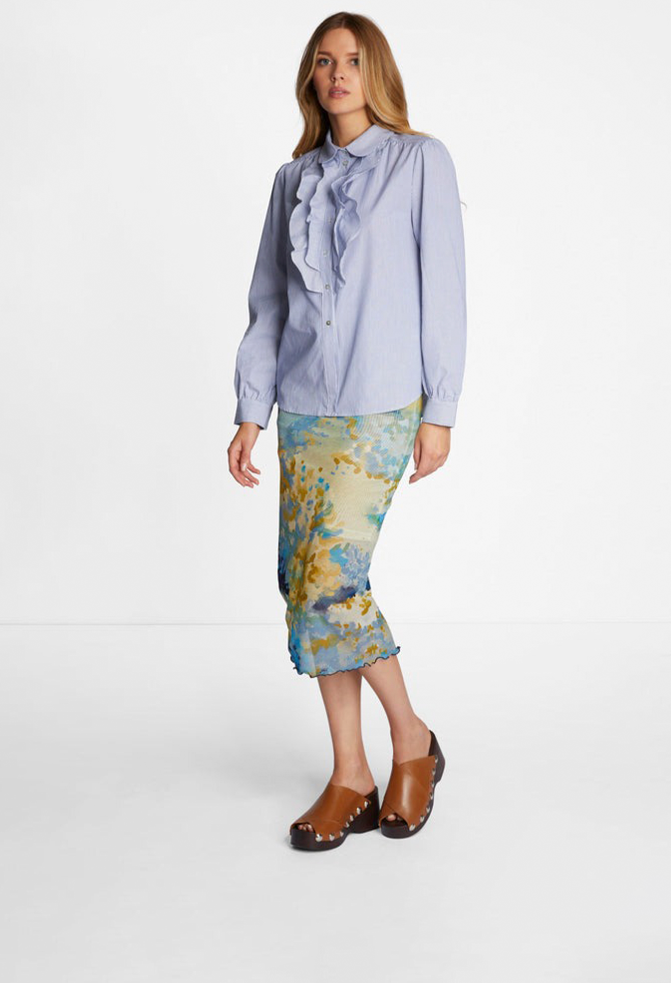 Блузка широкого кроя имеет воротник в стиле Питера Пэна и романтические рюши. Он изготовлен из тонкого органического хлопка. Длина для размера 42: 65 см. Окружность груди для размера 42: 90 см.