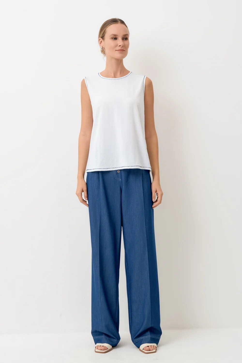 Блуза-топ A-образного силуэта. Горловина лодочкой. Проймы, горловина и низ блузы обработаны декоративной строчкой контрастными нитками.