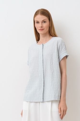 Блуза прямая, свободная. Горловина круглая. Застежка потайная на пуговицы и петли. Плечо спущенное. Манжет короткого рукава с отворотом. По спинке отлетная складка.