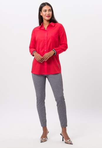 Длинная женская блузка с контрастными манжетами.Удлиненная блузка станет стильным дополнением любого повседневного гардероба. В дополнение к своим классическим особенностям, таким как воротник блузки, планка на пуговицах и нагрудный карман, элегантный дизайн блузки представлен в спортивном стиле полосатыми контрастными манжетами на рукавах и небольшим принтом над подолом. Длинная модель, облегающая фигуру, и легкая хлопчатобумажная ткань чрезвычайно удобны в носке. Эта длинная блузка также отлично смотрится как легкий жакет в расстегнутом виде.