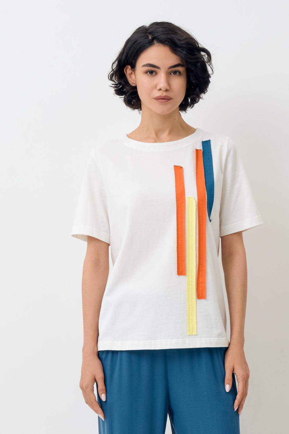 Блуза прямая. Горловина лодочкой. Полочка декорирована настрочными вертикальными деталями - полосками из ткани контрастных цветов.