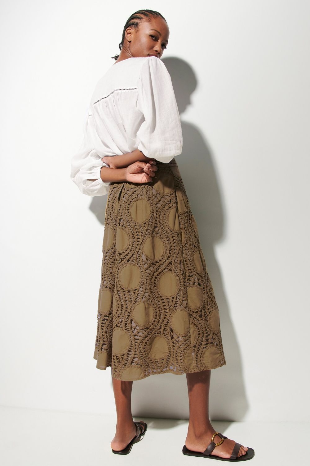 Блузка без воротника из элегантной непрозрачной ткани рами с ажурными деталями и планкой на потайных пуговицах. Широкие рукава с узкими манжетами на одной пуговице, тонкие рюши возле плеч и закругленный низ завершают образ.
