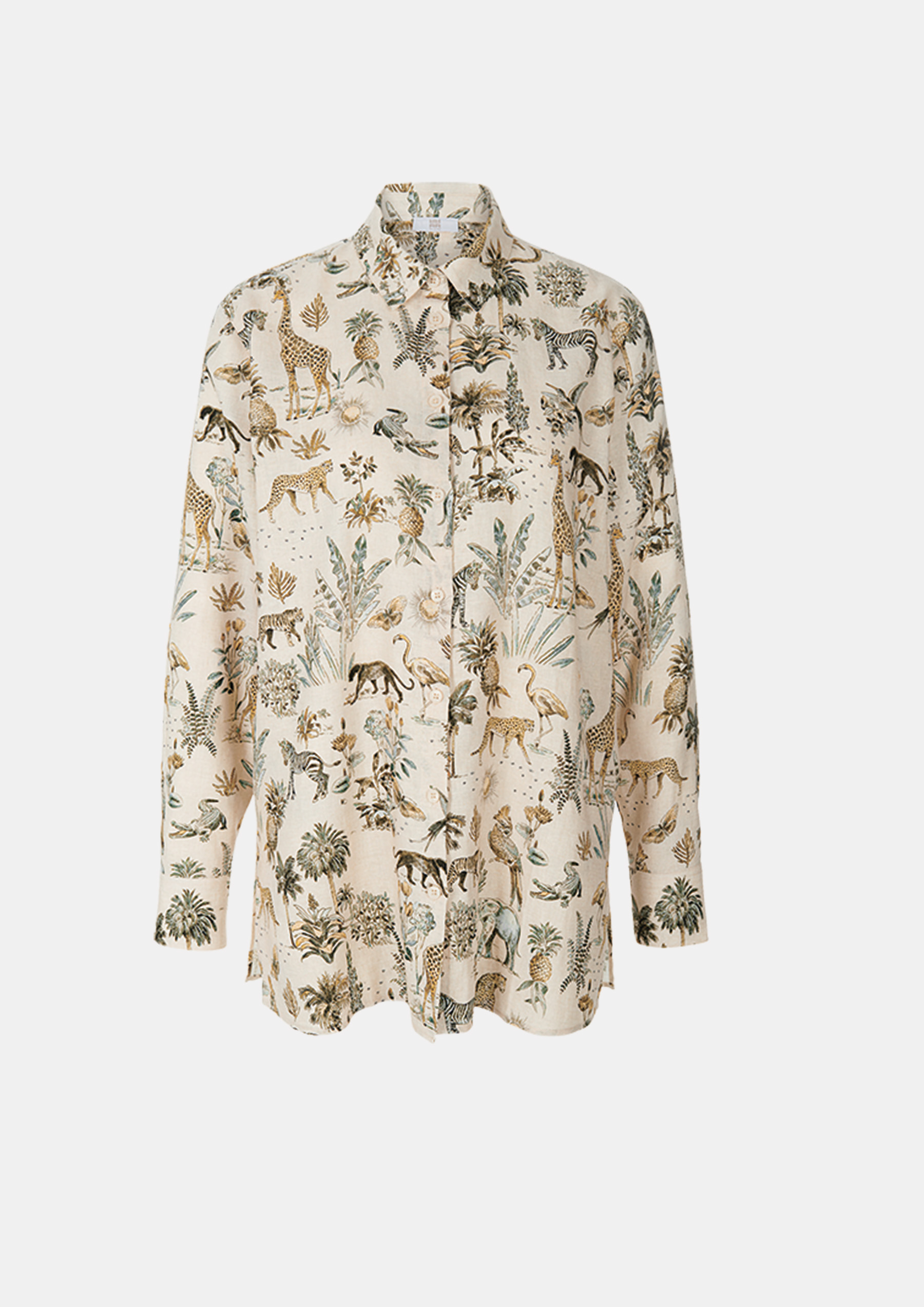 Красиво сшитая льняная блузка с «животным» принтом сафарино. Отличная базовая вещь, идеальная для непринужденной повседневной носки. Сочетайте с топом соответствующего цвета и расстегнутой блузкой. Высококачественная прохладная льняная ткань дышит и прекрасно сочетается с легкой летней одеждой.