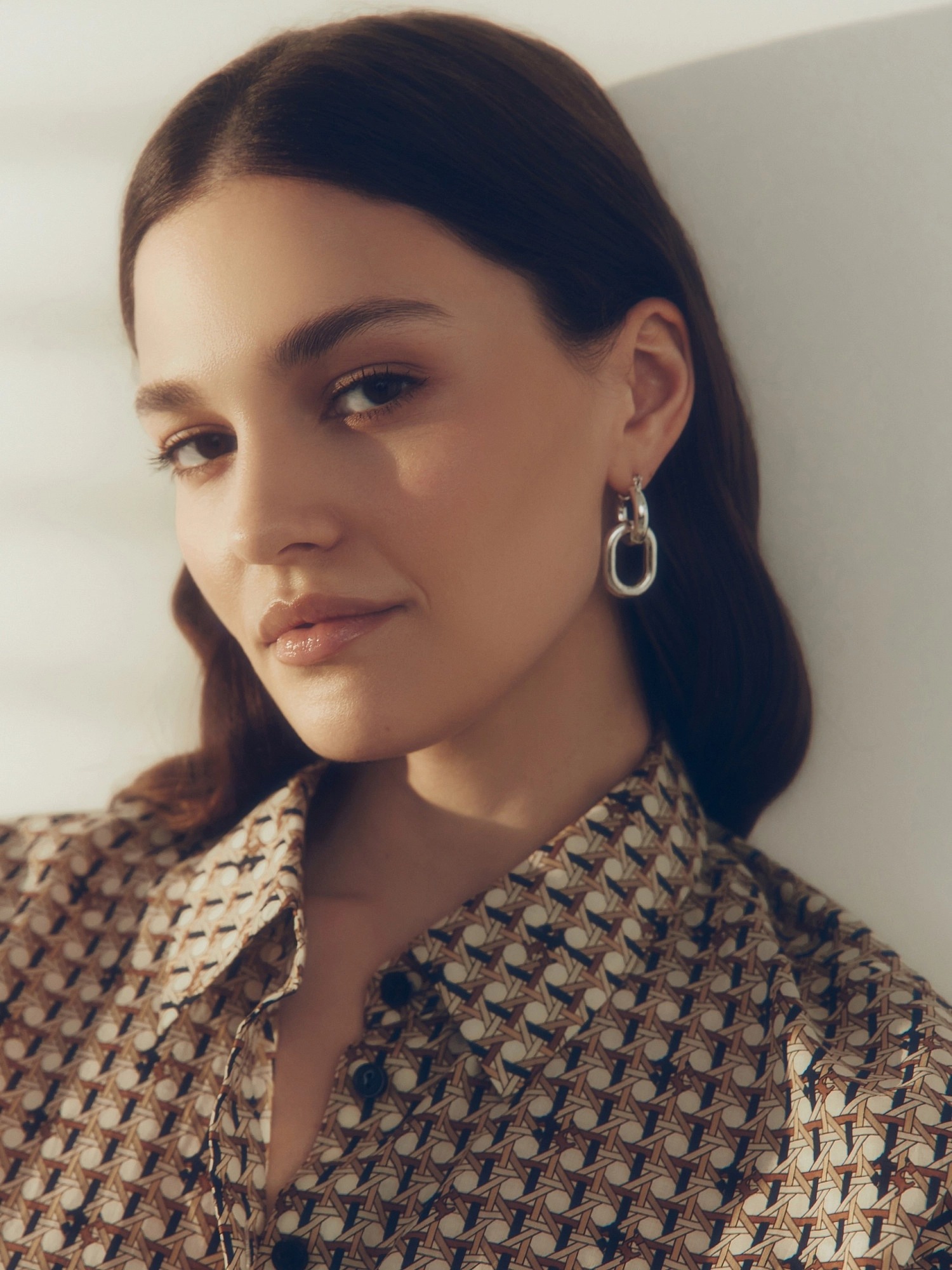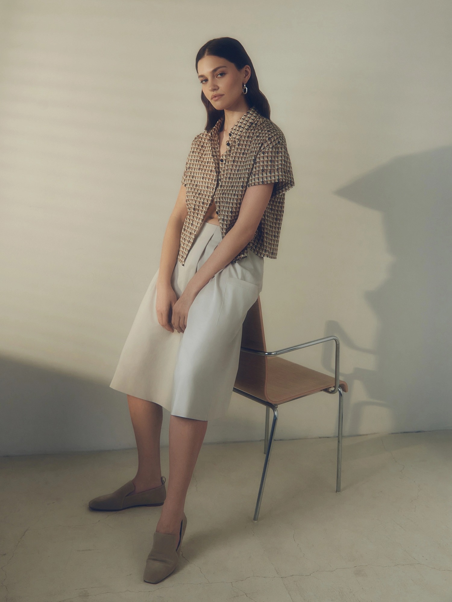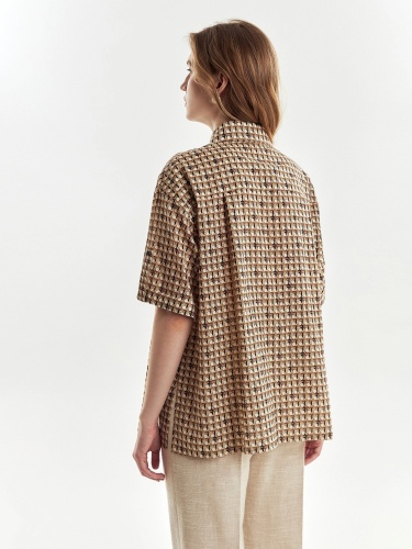Свободная хлопковая блуза с отложным воротником и планкой в принте идеально впишется в ваш весенний гардероб. Короткий и широкий рукав с патой позволит активно проводить время в городе. По бокам небольшие разрезы.
