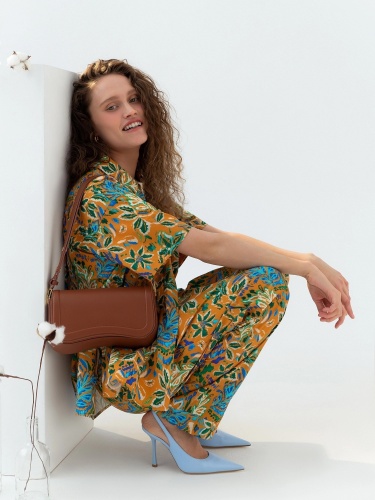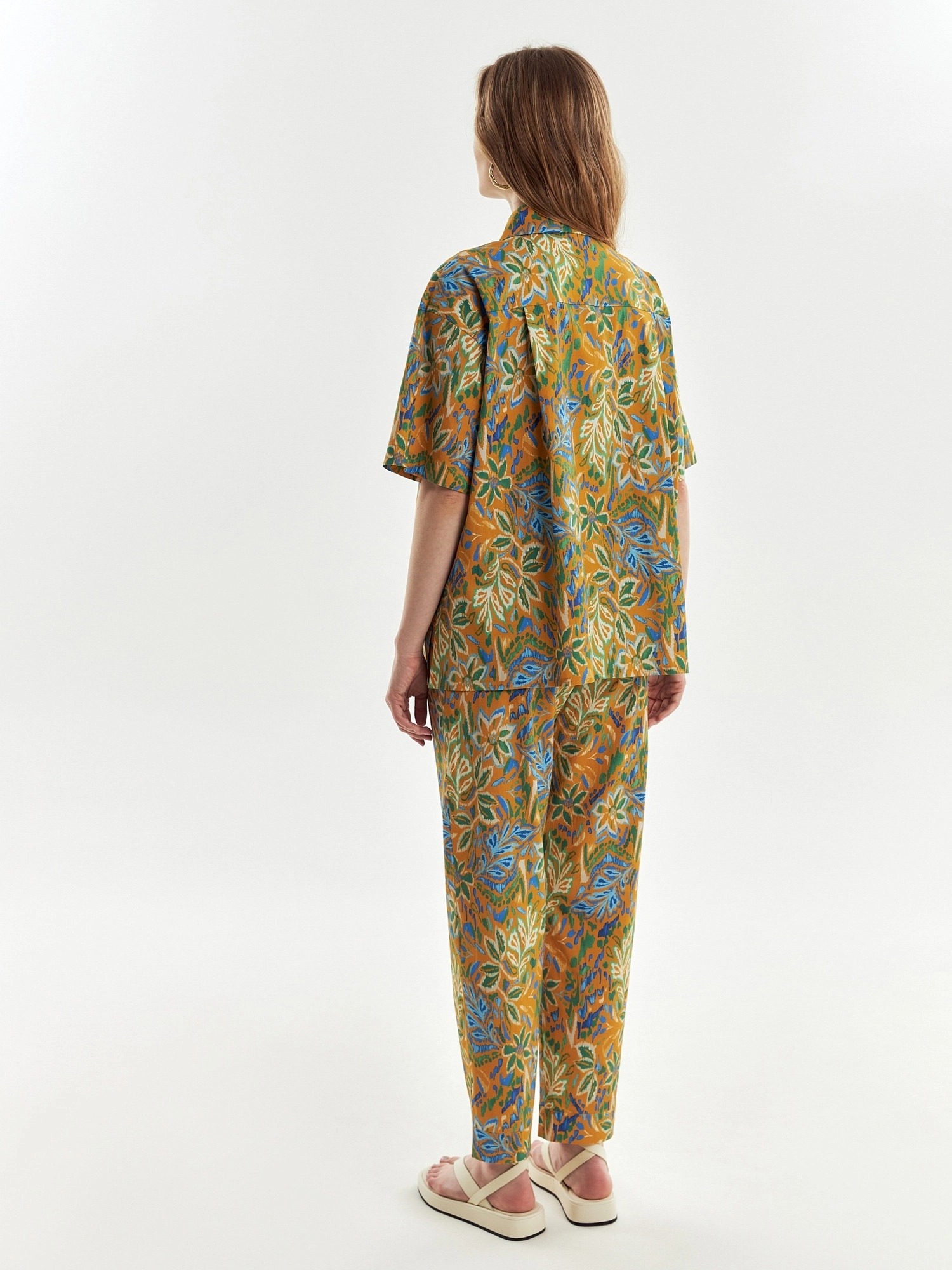 Свободная хлопковая блуза в принте идеально впишется в ваш весенний гардероб. Короткий и широкий рукав позволит активно проводить время в городе. Отложной воротник, застежка на пуговицы. На полочке накладные карманы с клапанами. На спинке кокетка с бантовой складкой. Спинка длине полочки, у блузы есть разрезы по бокам.