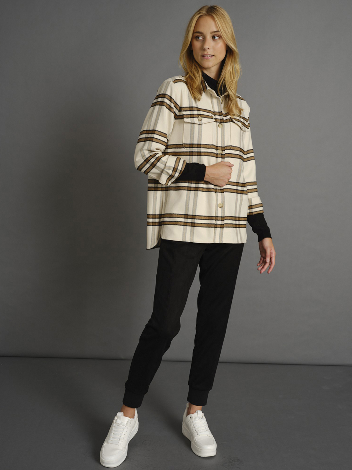 Рубашка в крупную клетку предпочтительно носить с водолазкой или рубашкой и узкими брюками или джинсами. свободная, прямая форма; планка с пуговицами и отложной поротник; длинные рукава с манжетами на пуговицах; два нагрудных кармана с клапанами и пуговицами; закругленный подол рубашки; Длина по размеру 42 (российский) = 72 см