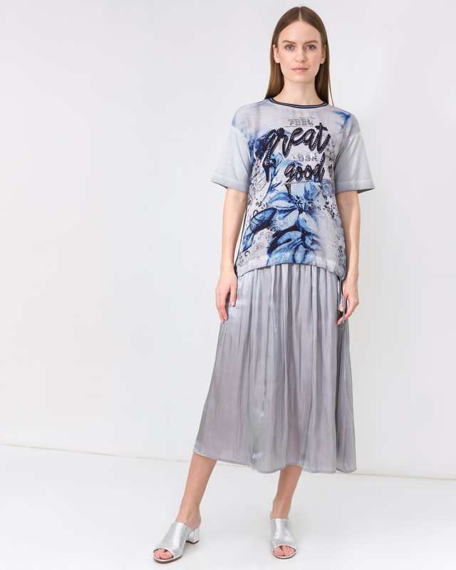 Блузка свободного кроя с абстрактным принтом спереди. Короткий втачной рукав, спущенная линия плеч. Круглый вырез горловины обрамлен контрастной бейкой.