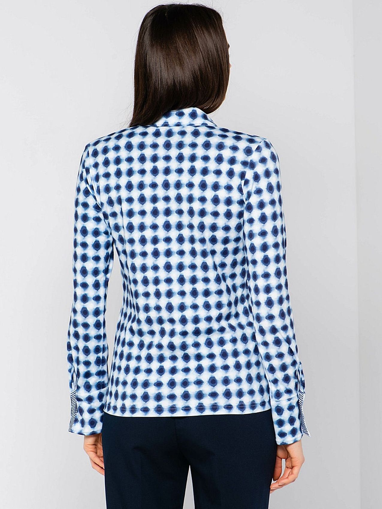 Блузка-рубашка привлекает к себе внимание благодаря трендовому принту батик. Отложной воротничок, V-образный вырез, застежка на пуговицах, длинные рукава с манжетами. Эта женственная модель слегка приталенного силуэта позволит создать множество современных образов!