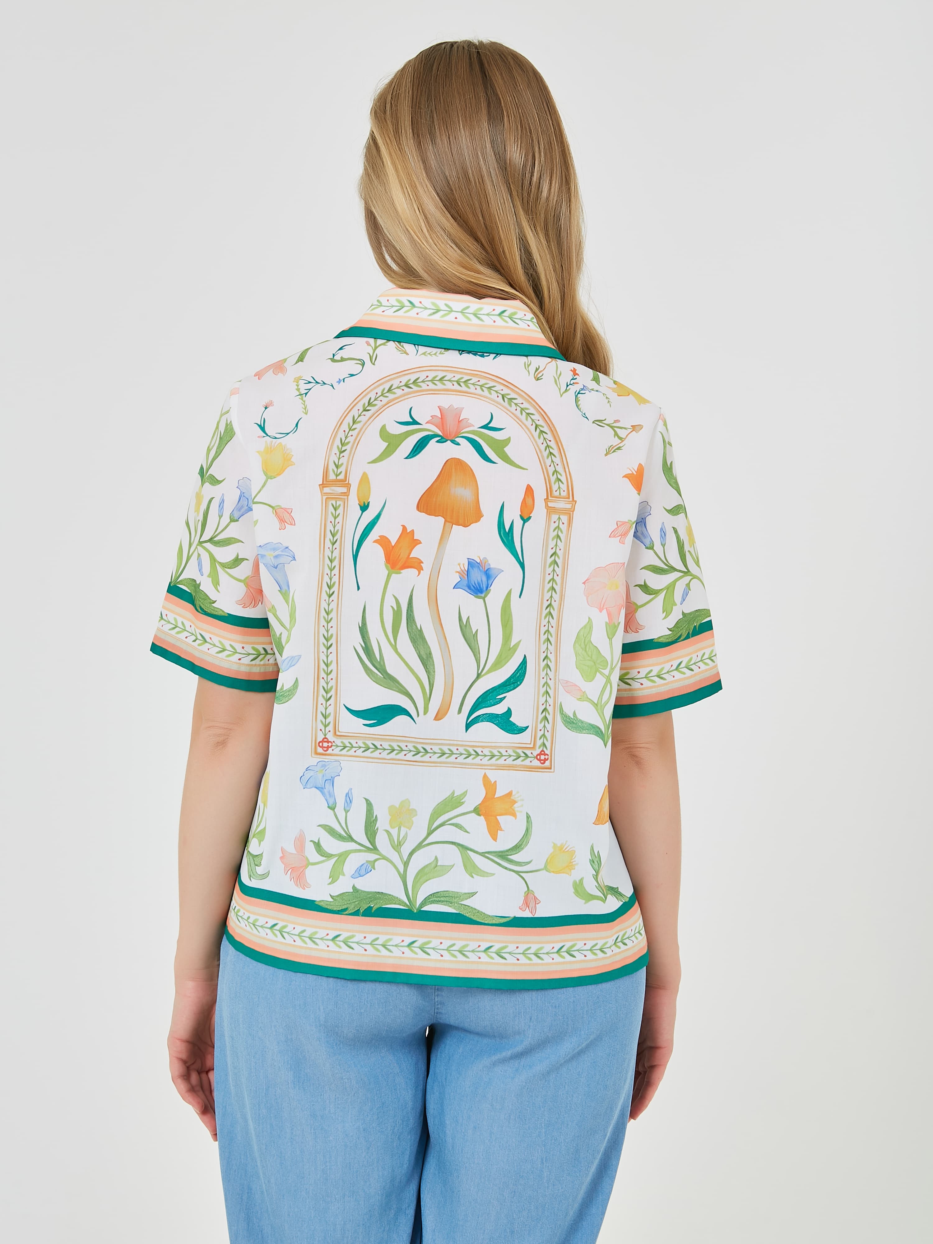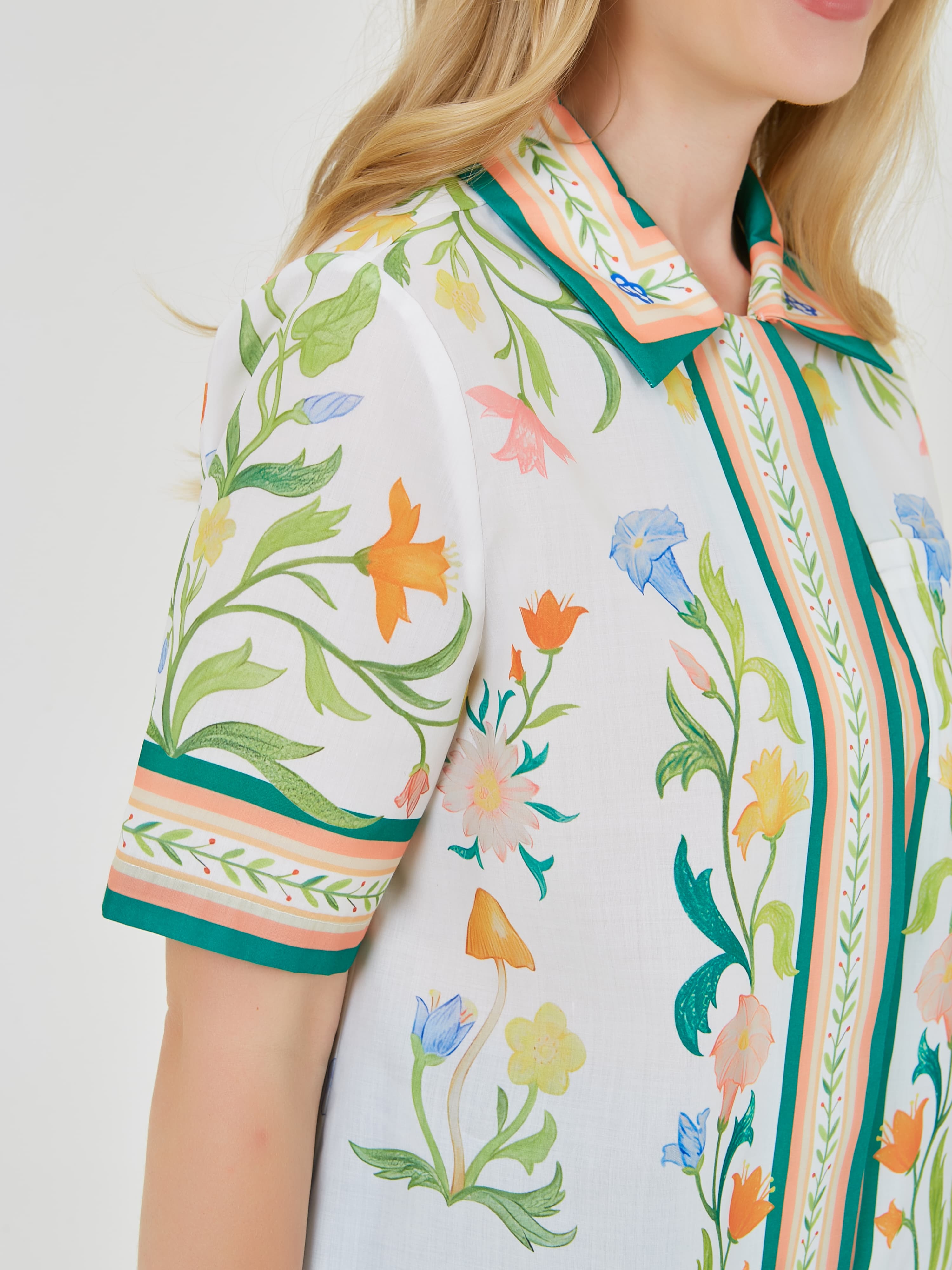 Женская рубашка с короткими рукавами и спрятанными пуговицами. Принт в виде цветов и листьев в теплых тонах расположен в рамках на рубашке. Коллекция Весна-Лето 2025. Капсула "Марракеш". Параметры модели: 89-70-92, рост 167, размер 44-46