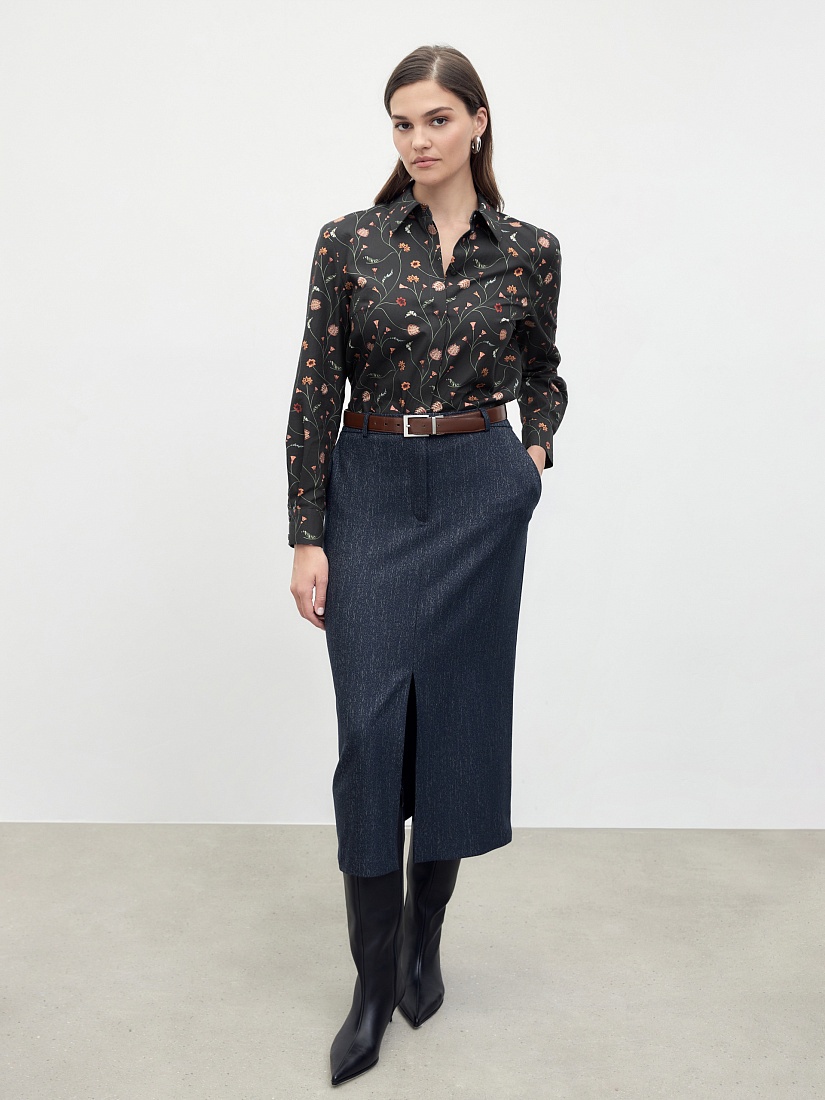 Прямая удлиненная блуза из принтованной хлопковой ткани, с классическим отложным воротником и супатной застежкой на пуговицы. Рубашечный широкий рукав на узком манжете. На спинке кокетка со складкой.
