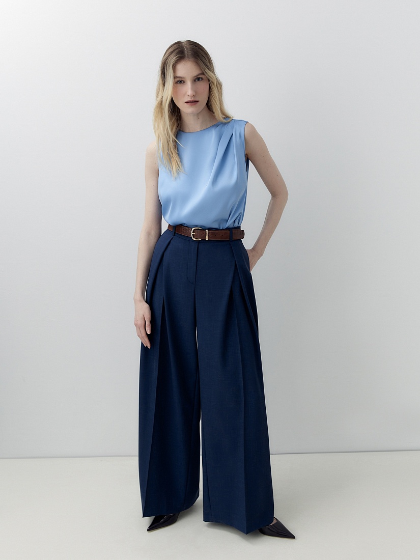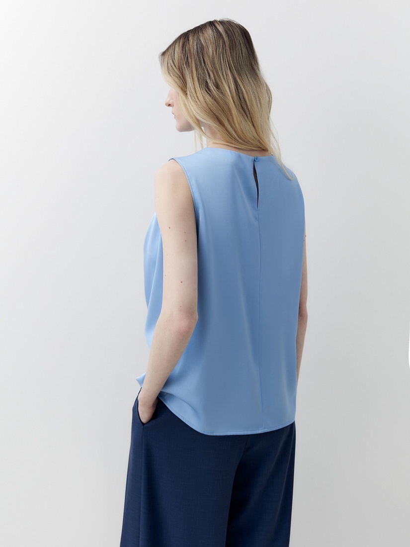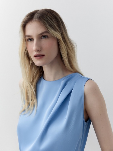 Прямая блуза из голубого атласа с круглой горловиной и складками по плечу. На спинке капелька и пуговицы.