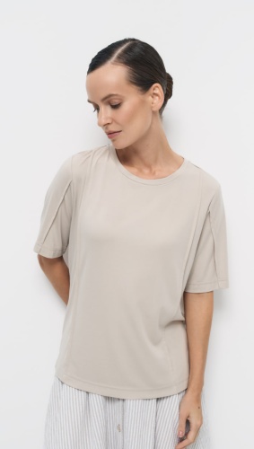 Свободная блуза прямого кроя создана из высококачественной испанской вискозы в нежном оттенке «облачное утро». Модель отличается интересным дизайнерским решением — вертикальными защипами, расположенными по передней и задней частям изделия, а также на рукавах. Эти элементы придают изделию структурированность и утонченность, создавая гармоничный и продуманный образ.