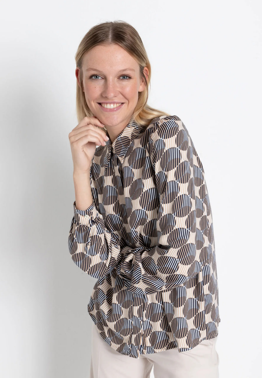 Струящаяся вискозная блузка MORE & MORE с графическим принтом в темно-синем и бежевом цветах отлично смотрится с джинсами, но ее также можно носить с классическими деловыми брюками.