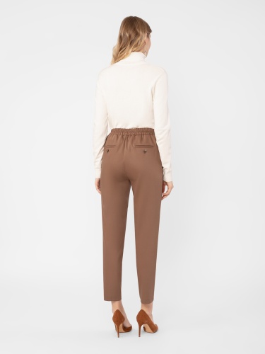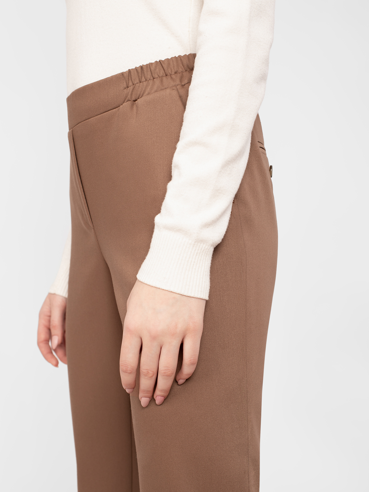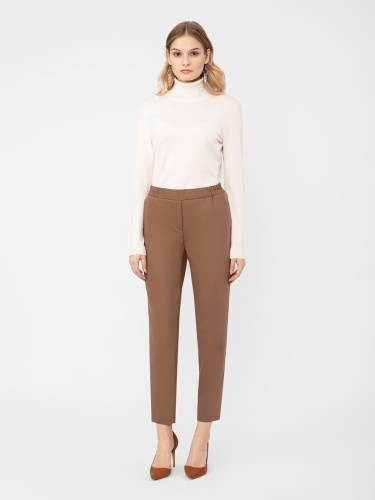 Брюки в стиле кэжуал, зауженные к низу, длина 7/8. Средняя посадка. Пояс на резинке. Спереди заложены складки. Боковые карманы рабочие.