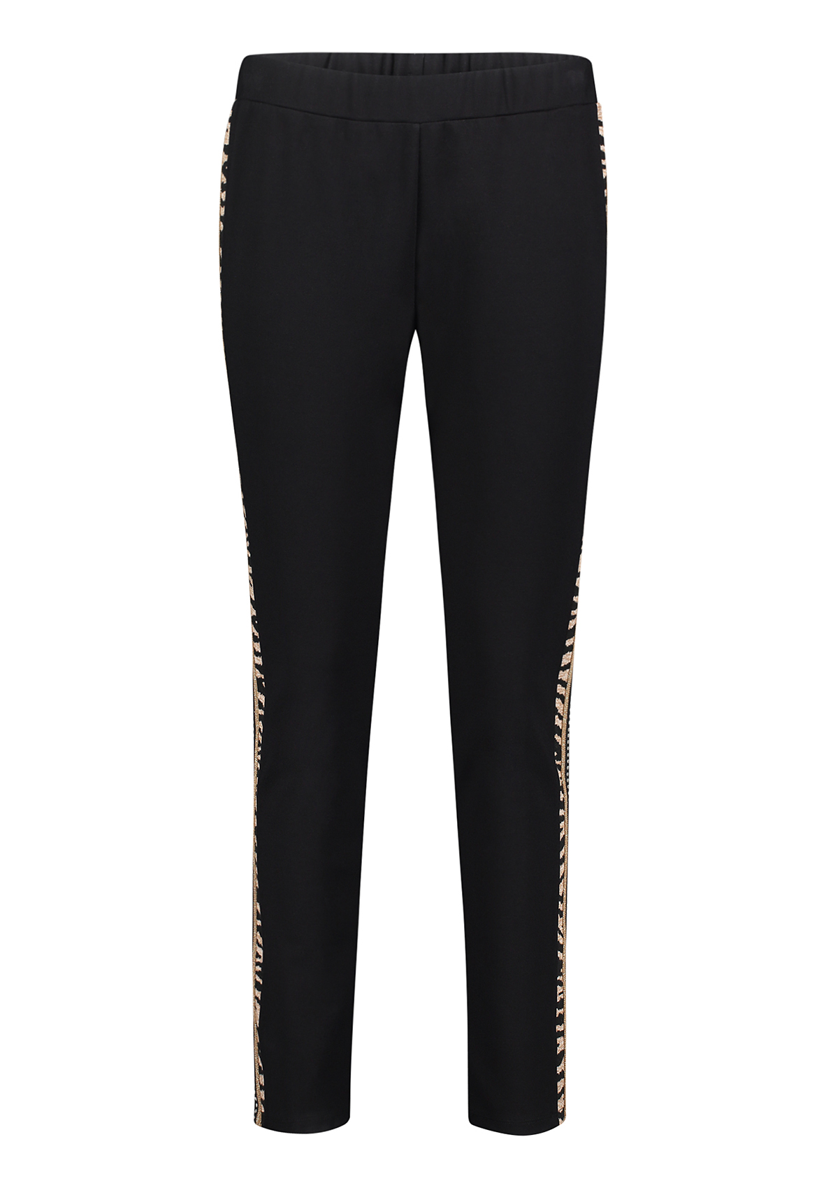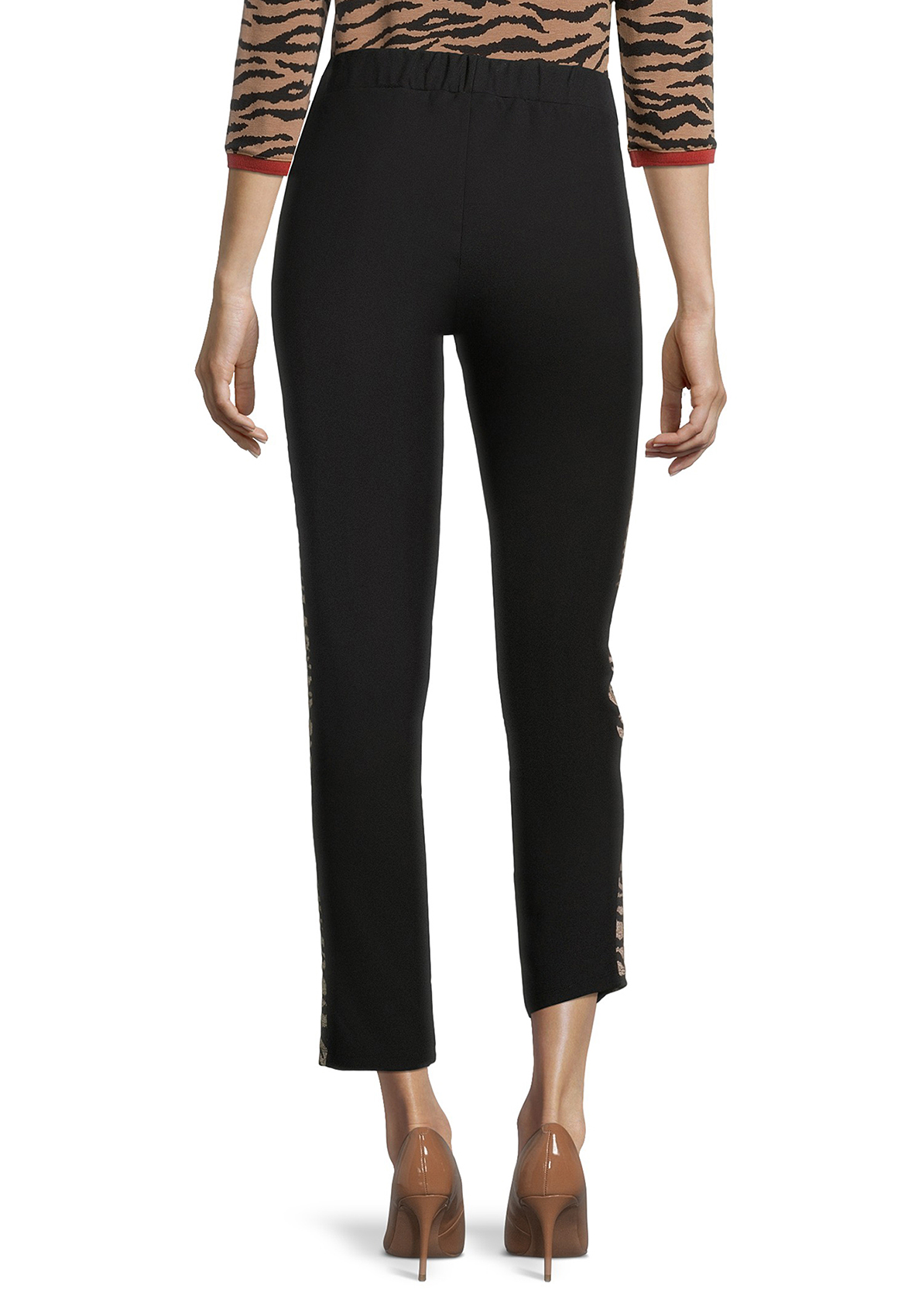 Укороченные брюки в сопртивном стиле. Средняя посадка с эластичной лентой на поясе обеспечивают удобство в ношении. Яркий акцент модели - вставки-лампасы с анималистическим принтом. Приятный к телу материал из вискозной смеси.