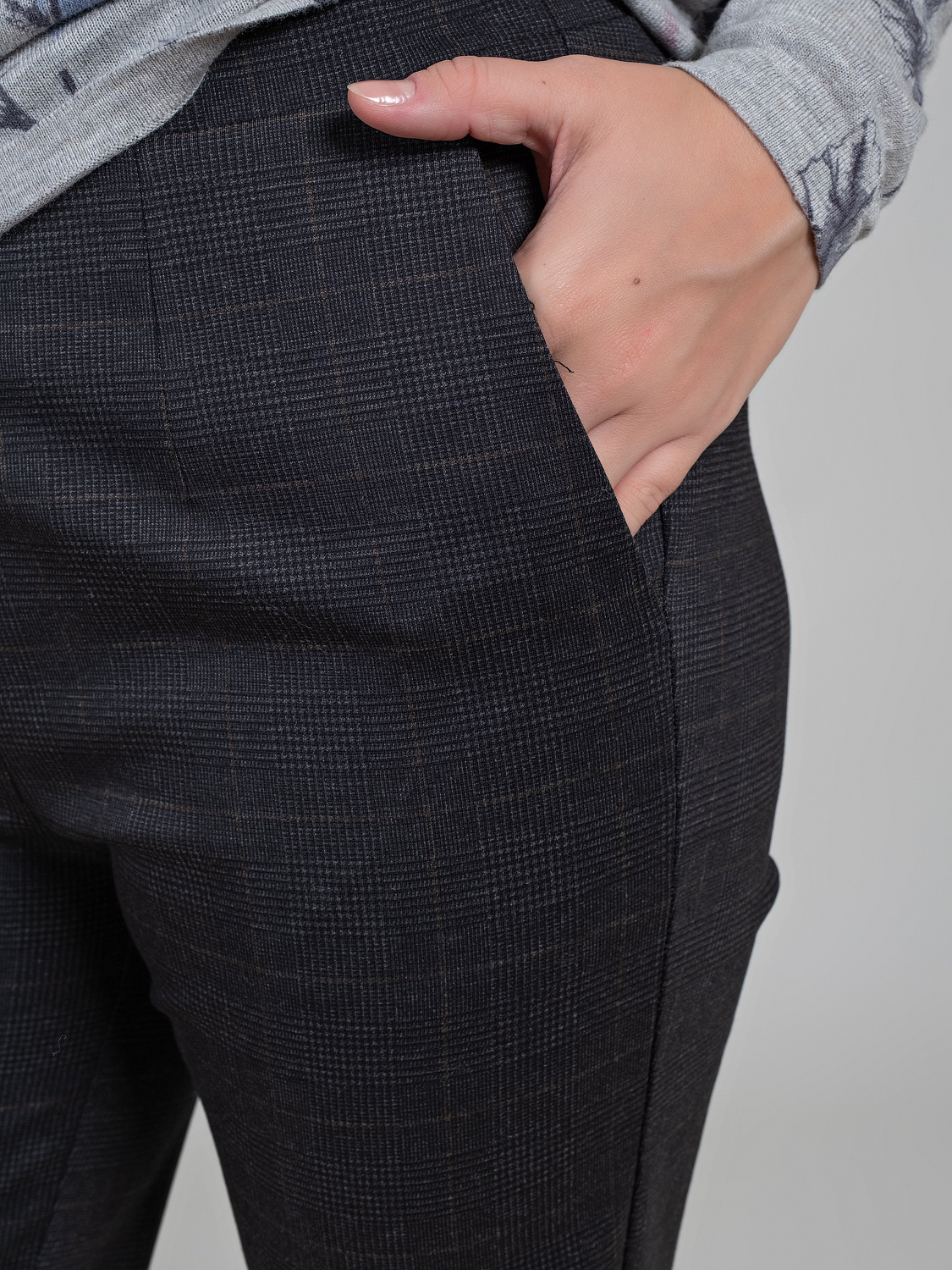 На сайте указаны российские размеры. Брюки средней посадки в клетку отличный вариант для офиса и повседневной носки. Состав материала из смеси вискозы и полиэстера обеспечивает эластичность и хорошую посадку по фигуре. Имеются два боковых кармана. Ткань: костюмная смесовая ткань средней плотности (65% вискоза, 27% полиэстер, 8% эластан). Идеальна для межсезонья и холодного времени года. Крой: классическая прямая модель брюк по фигуре. Имеет завышенную линию талии, которая гармонизирует и вытягивает силуэт, скрывая недостатки, а также два функциональных кармана по бокам. Прекрасный крой и хорошо подобранный состав ткани позволяет брюкам садиться на разные типы фигур – в линейке представлены размеры от 46 до 54. Отделка: небольшие разрезы в области щиколоток добавляют удобства при ходьбе, а еще эта особенность позволяет носить брюки с различной обувью – высокими и низкими ботинками, туфлями и кедами.