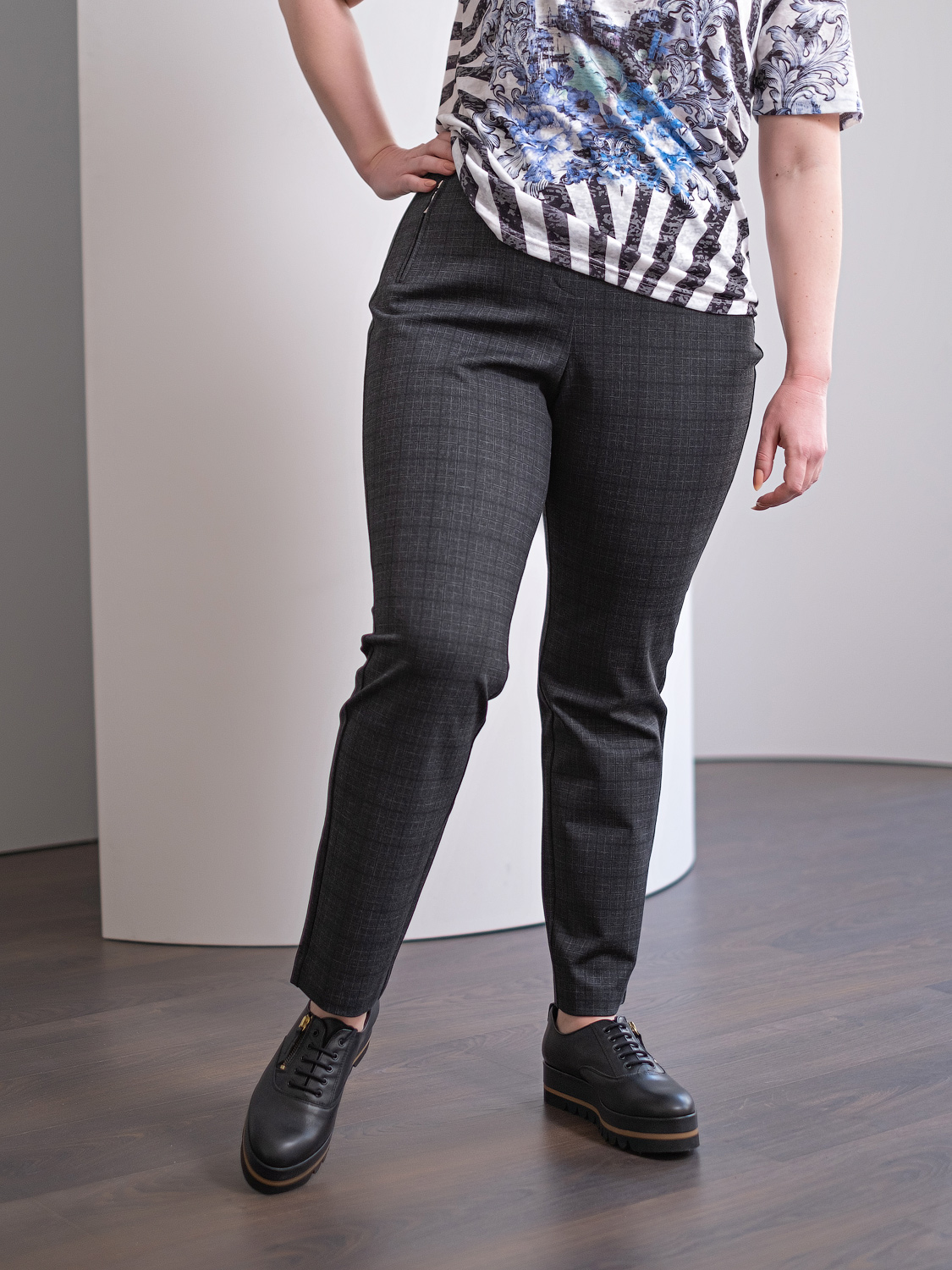 На сайте указаны российские размеры. Прямые клетчатые брюки – универсальный вариант для офисного и повседневного образа. Комфортная средняя посадка, боковые карманы на молнии, эластичный пояс, замок-молния спереди. Крой: модель прямого силуэта с завышенной линией талии позволяет подчеркнуть достоинства фигуры и скрыть возможные недостатки. Прямой крой и идеальная посадка брюк обеспечивают максимум комфорта. Имеют два кармана по бокам. Отделка: карманы закрываются на стильную декоративную молнию, которая добавляет изделию оригинальности и приковывает внимание к деталям.