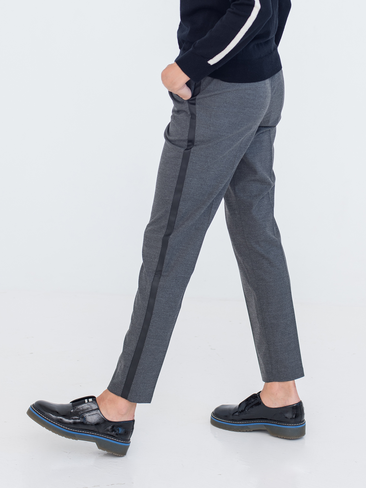 Прямые однотонные брюки с лампасами – оригинальный дизайн, выдержанный в деловом стиле. Комфортная средняя посадка, эластичный пояс с кулиской гарантируют удобство ношения. Приятный к телу материал. Трендовая длина 7/8. Брюки хорошо сочетаются с рубашкой, джемпером или блейзером.