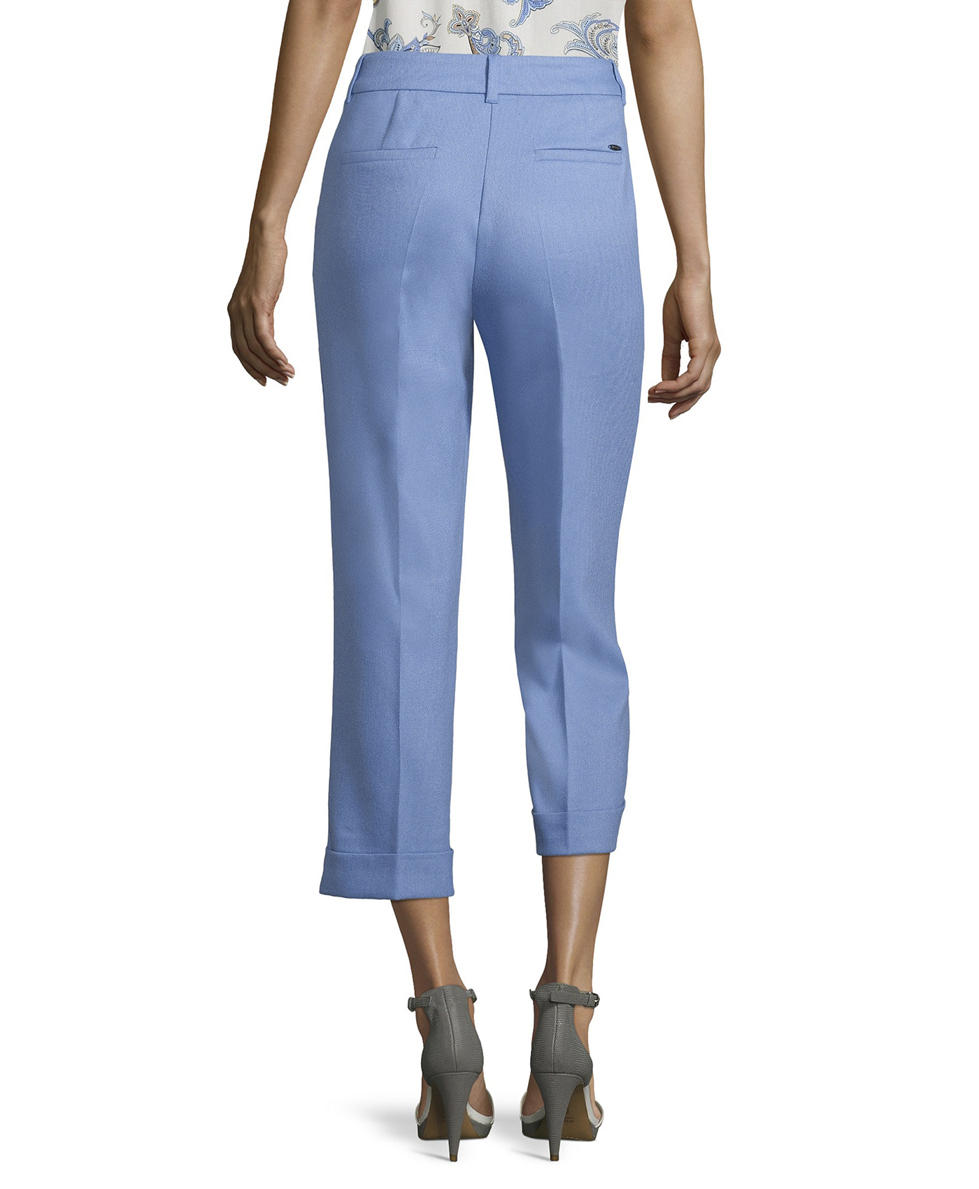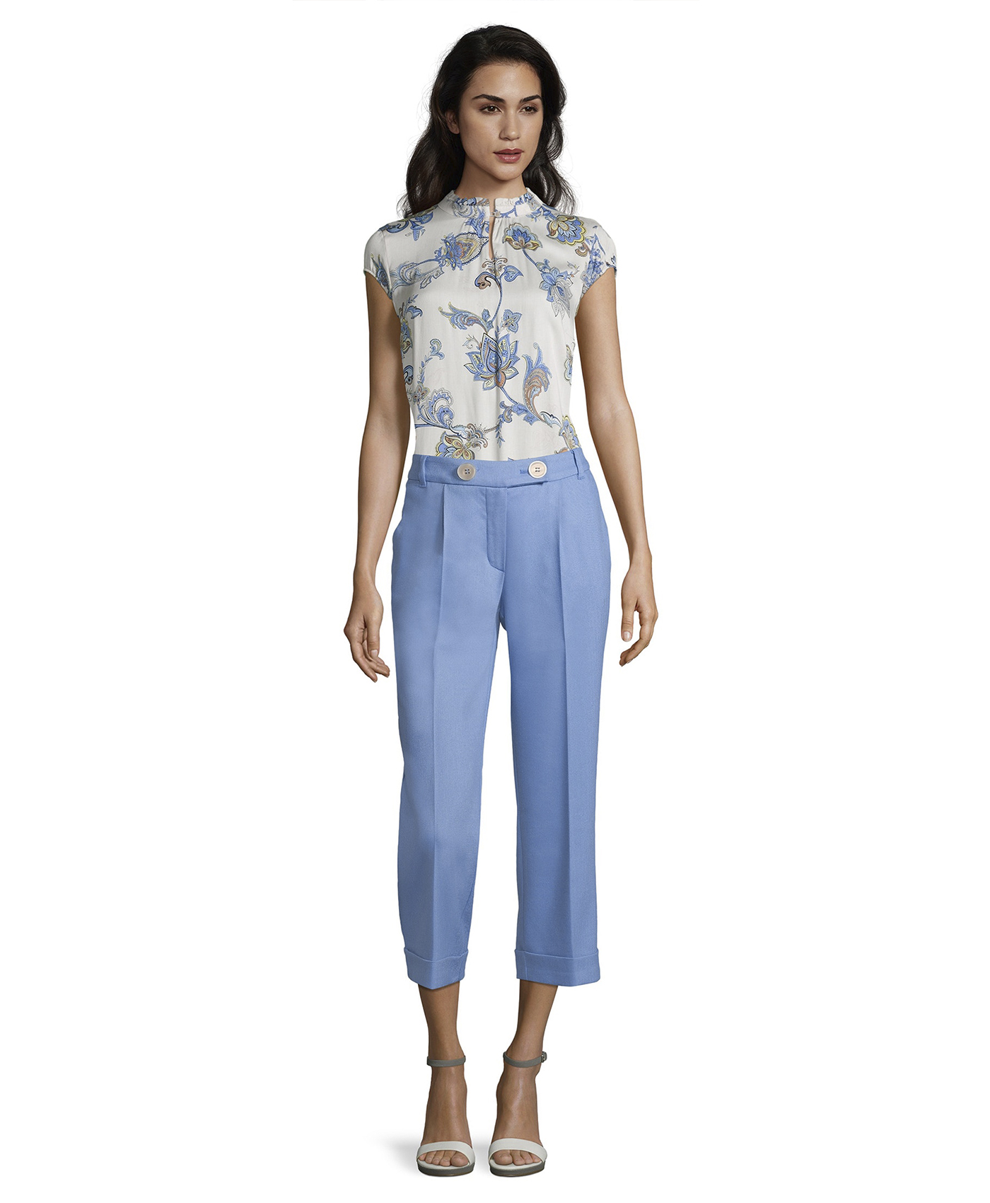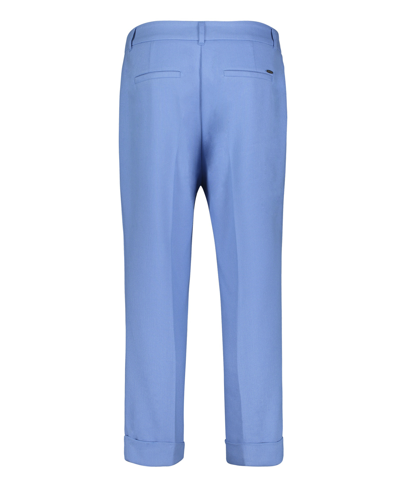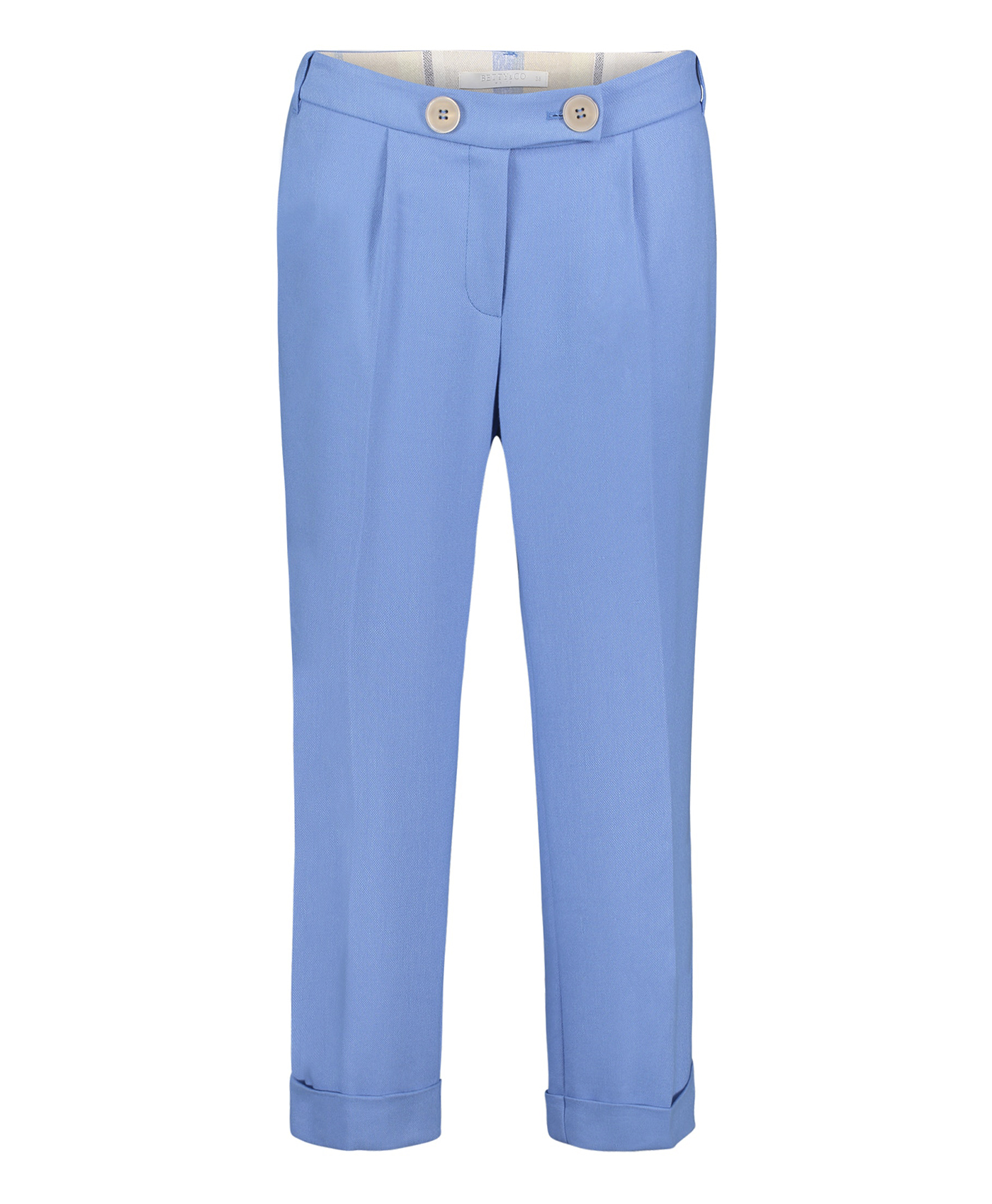 Брюки прямого кроя со стрелками и манжетами. Длина 7/8 позволяет подчеркнуть модную обувь. Приятный к телу материал. Актуальный голубой цвет. Завершают стильный дизайн две крупные пуговицы на поясе. Эти брюки гарантируют трендовый образ в сочетании с любым верхом и обувью.