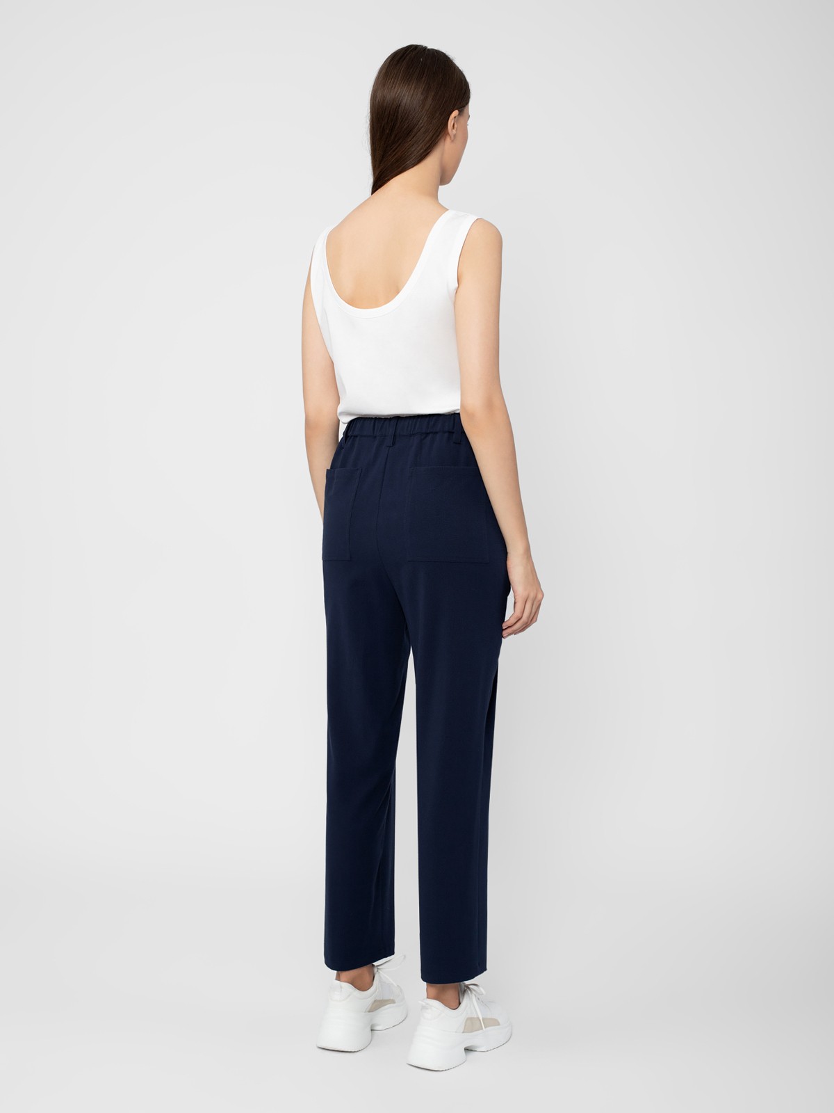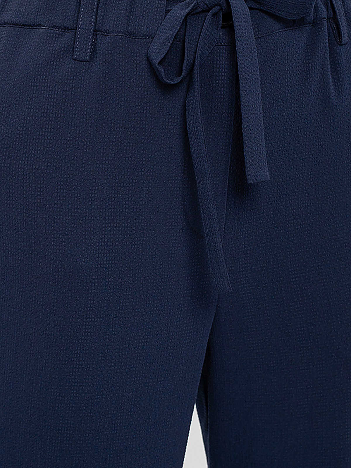 Брюки из фактурной ткани прямого силуэта на притачном поясе с резинкой, кулиской и завязками. Сзади крупные накладные карманы прямоугольной формы.