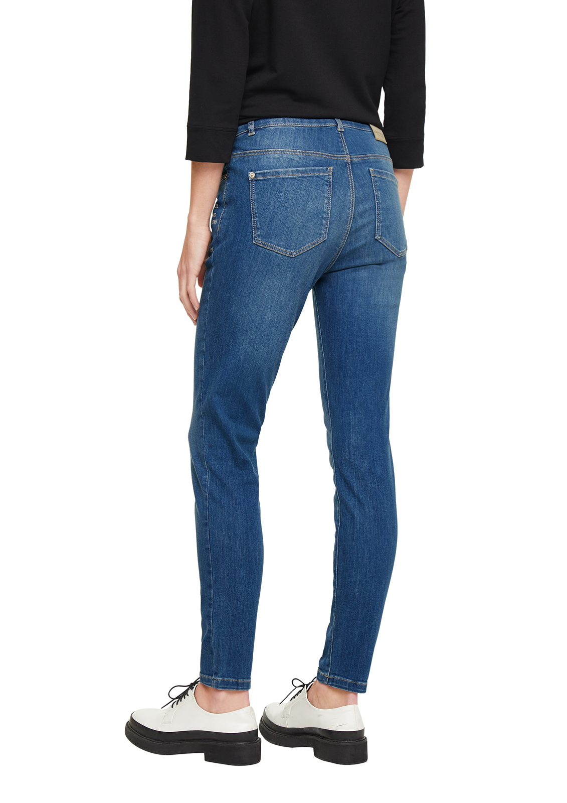 Зауженные джинсы с потертостями и принтом. Высокая посадка, пояс со шлевками. Внутренние передние и задние накладные карманы. Застежка на скрытую молнию и пуговицу.