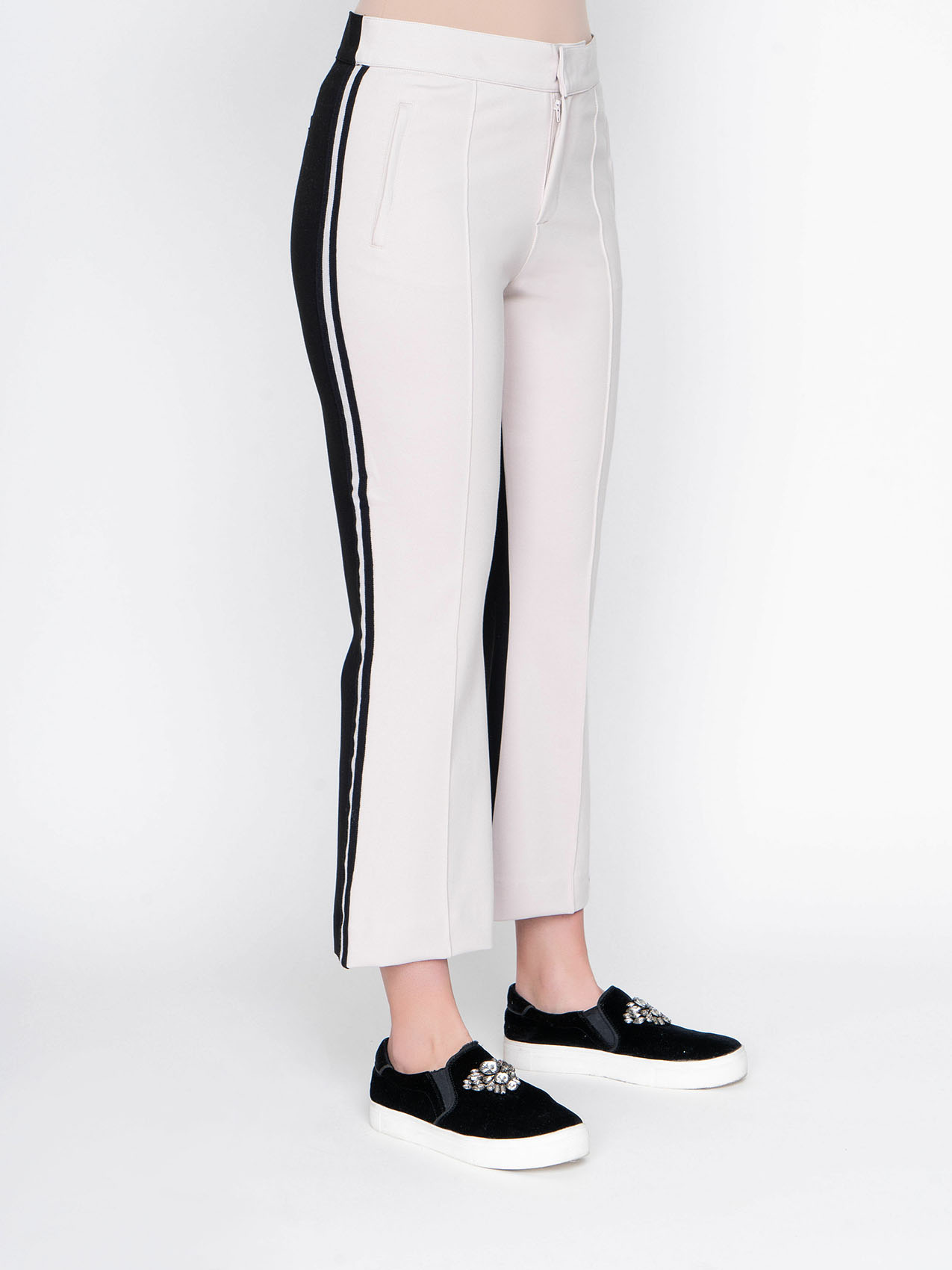 На сайте указаны Российские размеры. Брюки-клеш. Оригинальная двухцветная модель. Средняя посадка. Карманы с отрезным бочком. Длина брючин - 72 см.