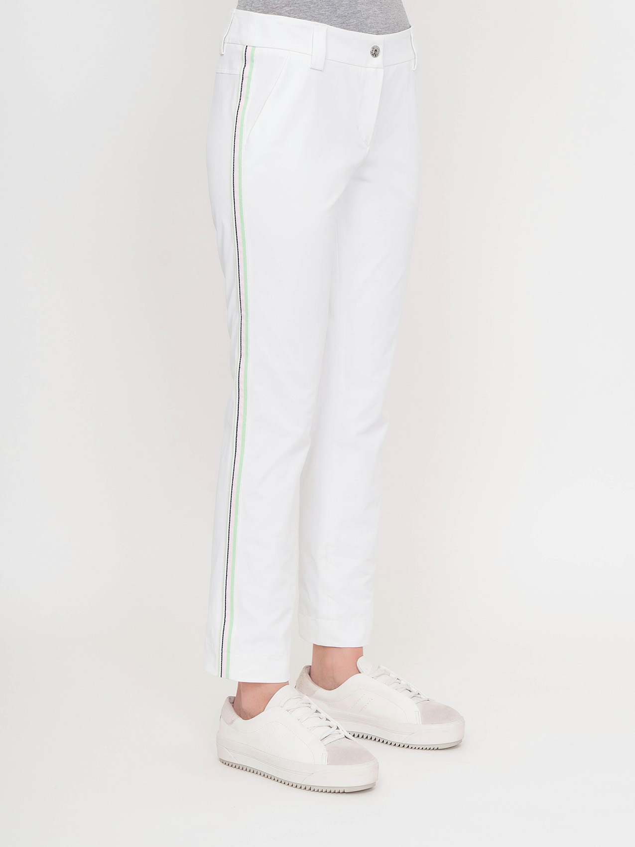 Светлые брюки - идеальный вариант для теплого сезона. Брюки средней посадки, прямого кроя. Декоративная тесьма по бокам, боковые карманы. Эта модель - универсальная пара для любого модного образа.