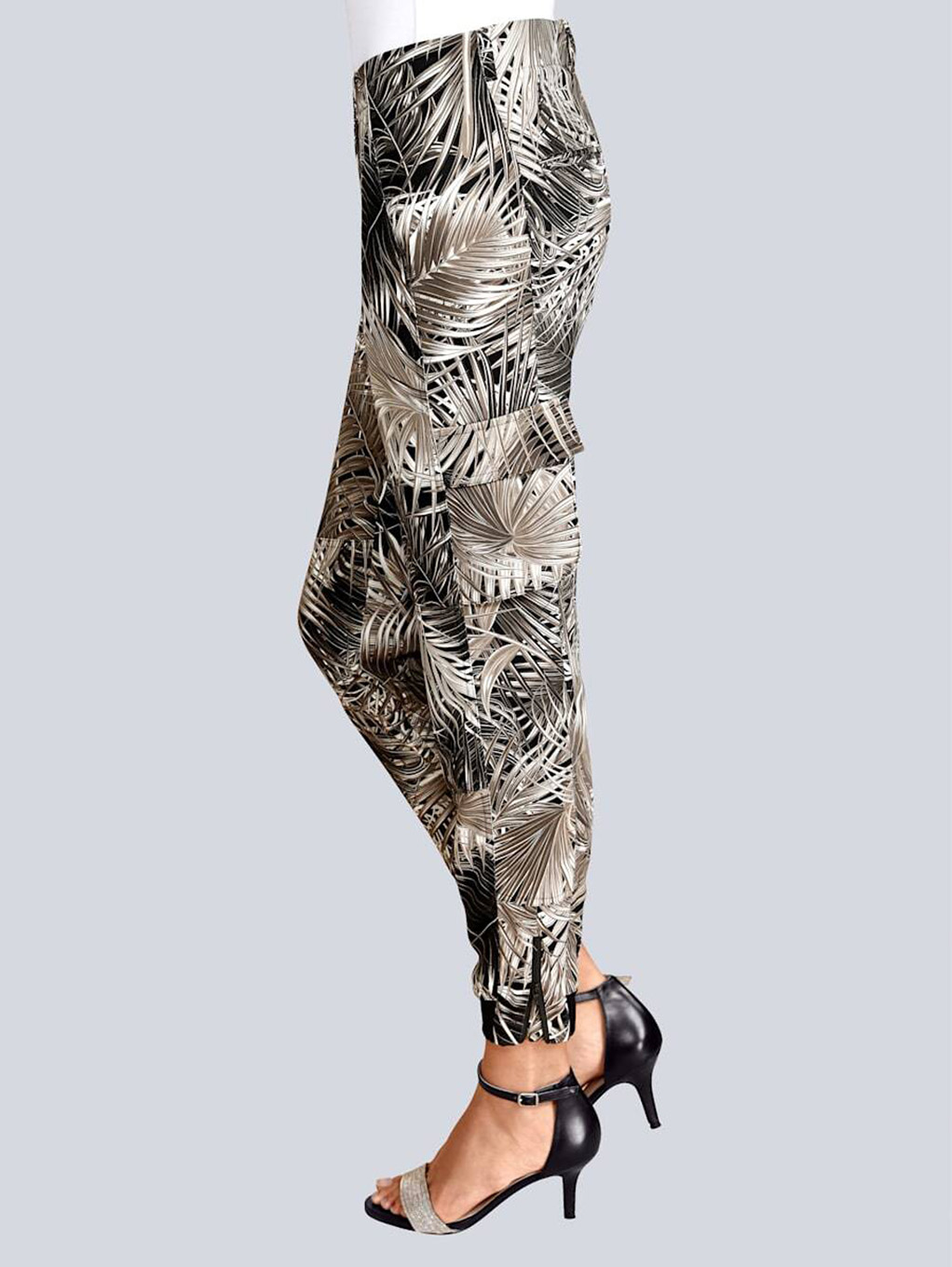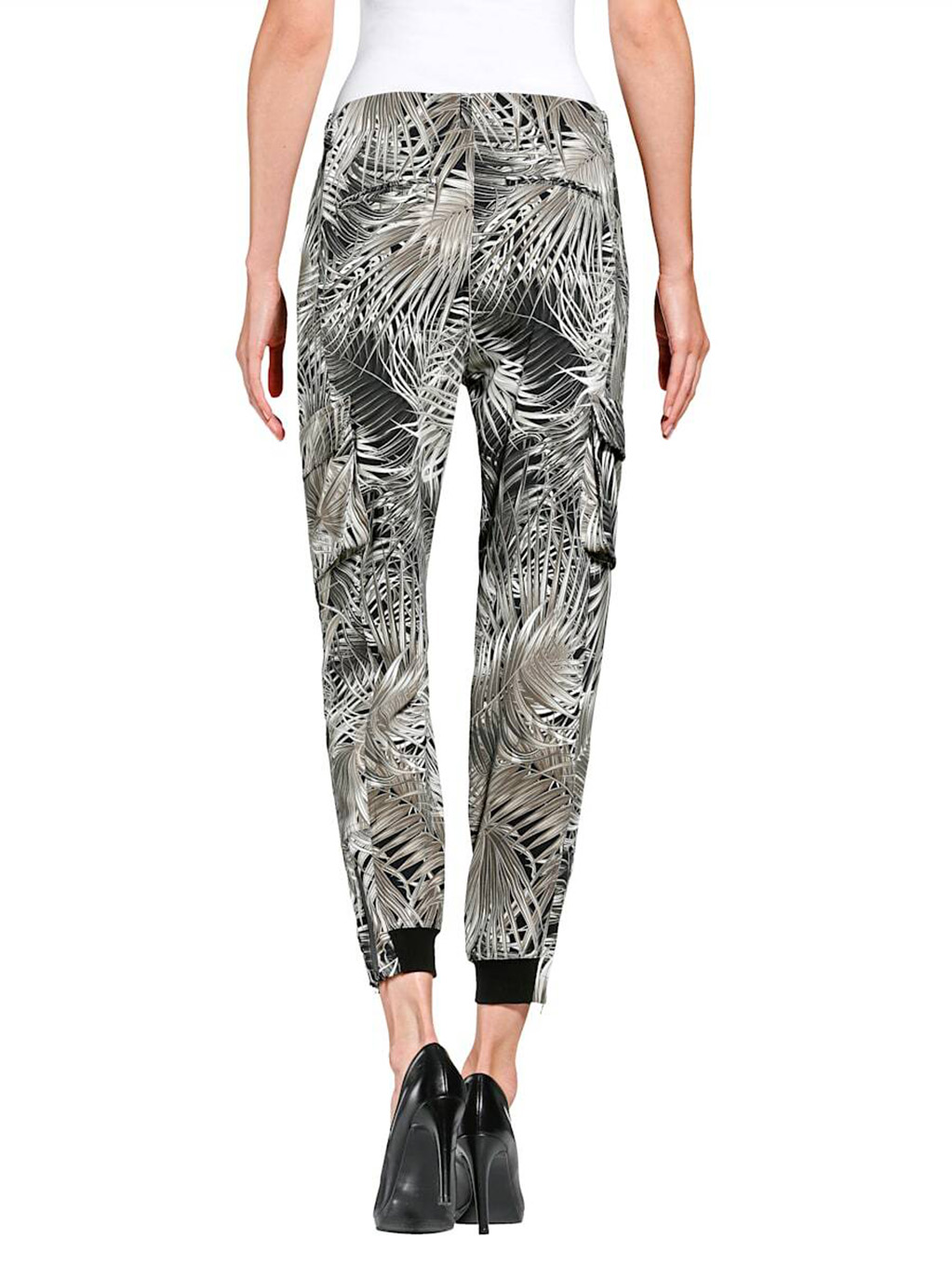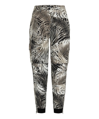 Брюки в трендовом принте с тропическими мотивами - наш модный фаворит! Зауженный книзу силуэт, средняя посадка, застежка-молния спереди, накладные карманы, манжеты и молнии по низу брючин. Эти брюки гарантируют создание актуального образа в сочетании с лаконичным вариантом верха и любой обувью.