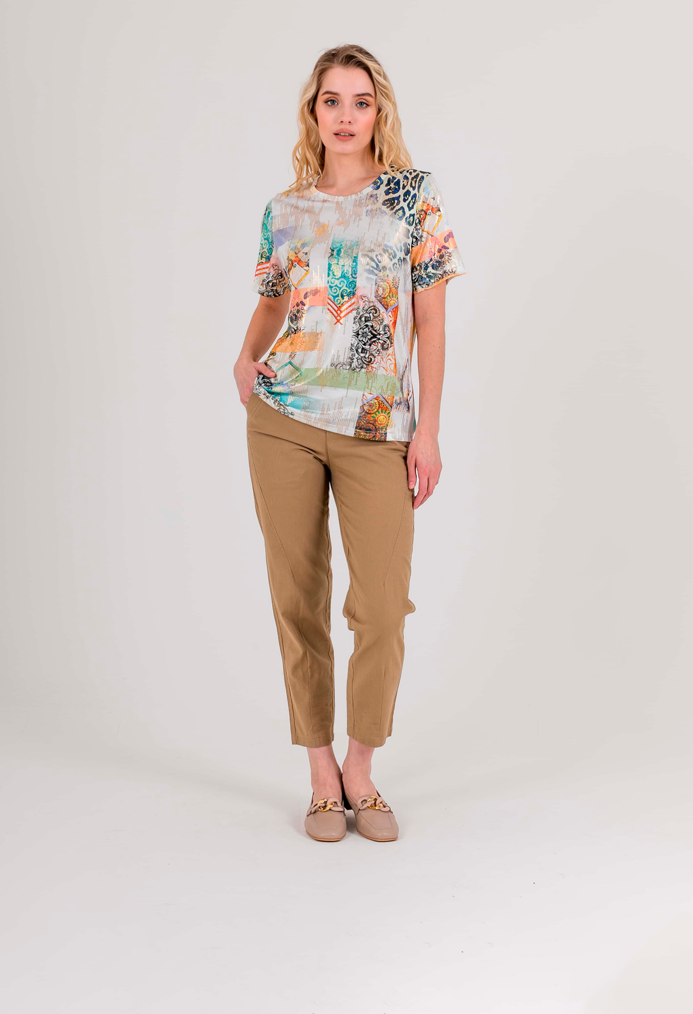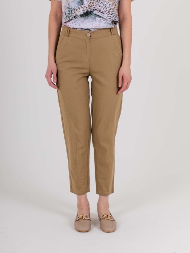 На сайте указаны российские размеры. Крой: стильная укороченная модель, красиво садящаяся по фигуре. Благородный бежевый оттенок, высокая посадка и функциональные карманы делают эти брюки абсолютным must-have во все времена. Создают подтянутый, стройный силуэт, удлиняют ноги и мастерски скрывают все недостатки. Отделка: оригинальные строчки в тон ткани, расположенные в верхней и нижней частях брюк, создают дополнительные вертикали и стройнят фигуру. Сзади расположены два прорезных кармана. Застегиваются на молнию и пуговицу. Имеют шлевки, что позволяет дополнять образ ремнем.