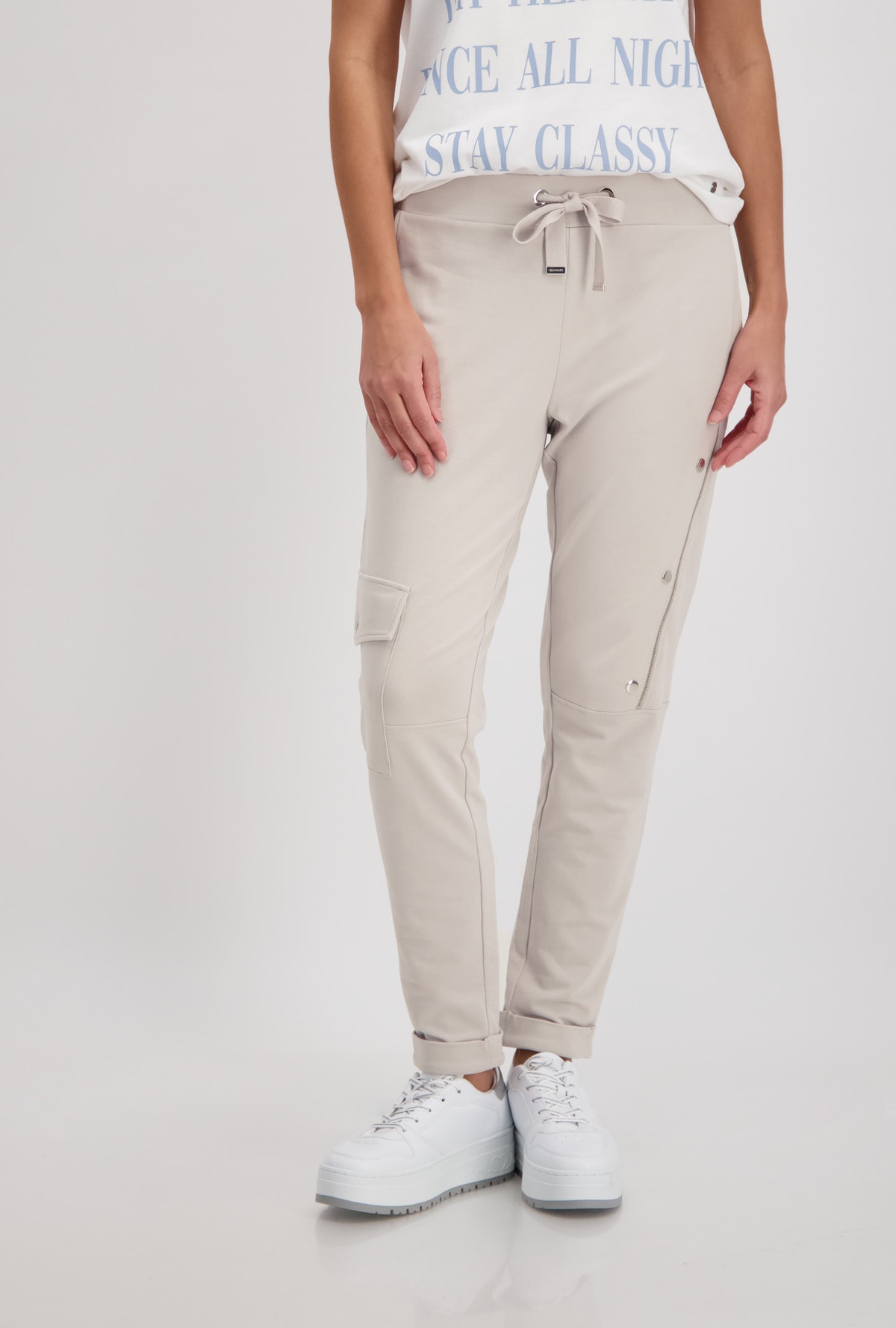На сайте указаны российские размеры. Спортивные джоггеры monari в байкерском стиле. Пояс украшен декоративными пуговицами, талия на кулиске с проушинами и завязками, а также ребристая спинка. Боковые карманы, накладной карман с клапаном на уровне колена на правой штанине и диагональный шов с застежкой-молнией и декоративными пуговицами на левой штанине завершают дизайн довольно простой модели джоггеров. Параметры модели: 42 размер, рост 179 см