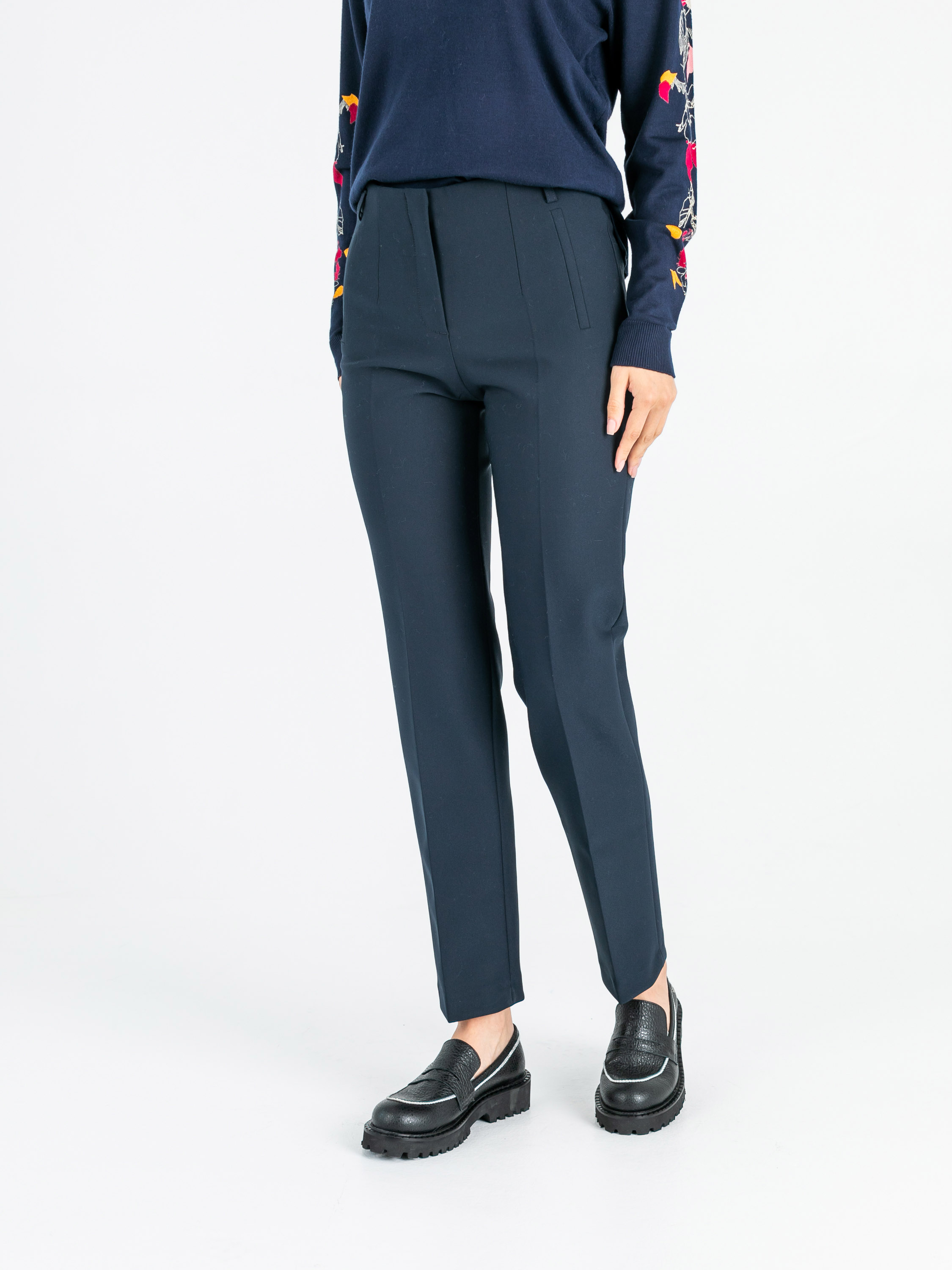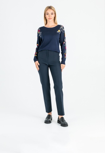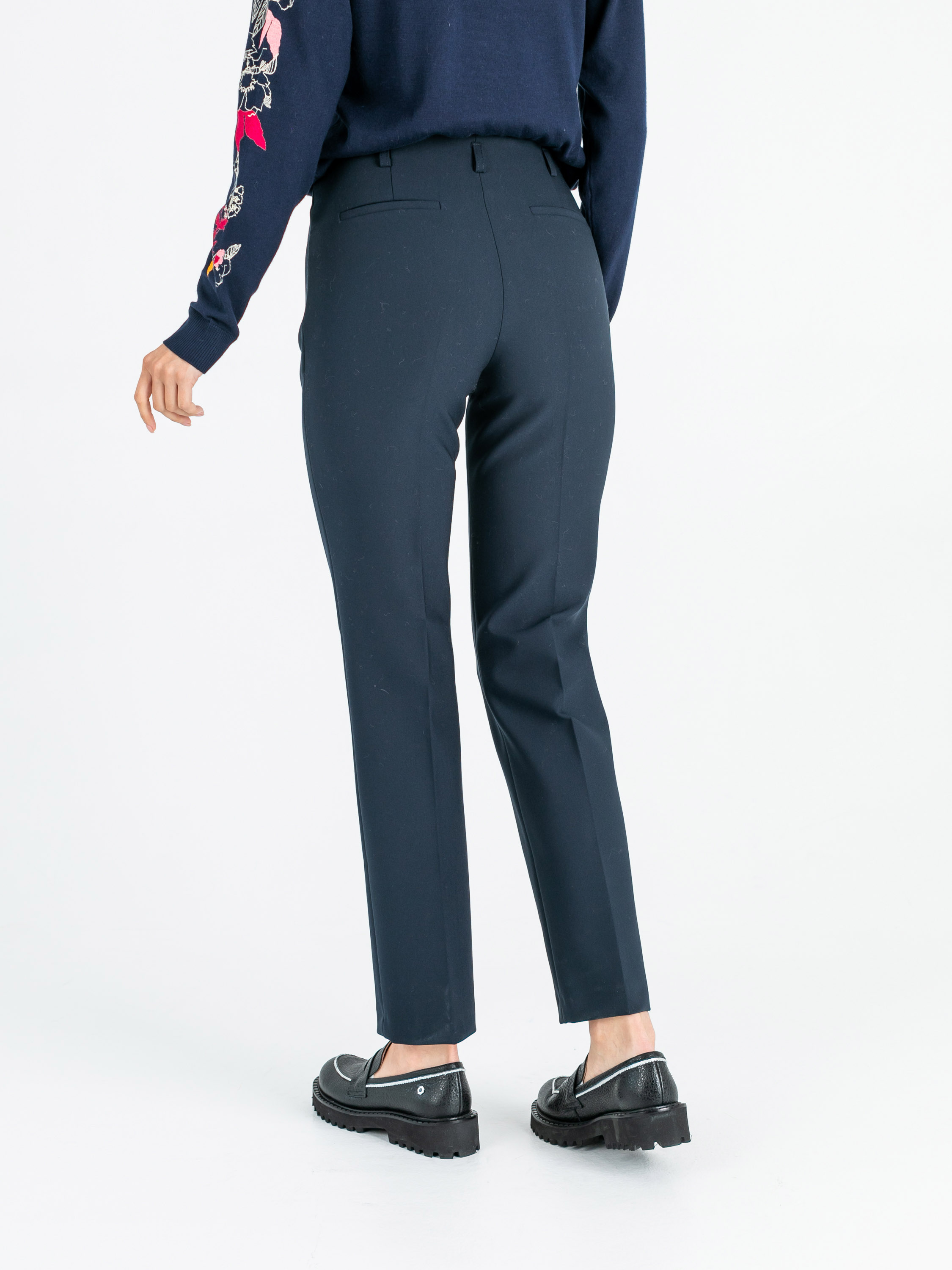 Классические брюки со стрелками и завышенной талией на скрытой пуговице. По 2 имитированных кармана спереди и сзади. Ткань: однотонная костюмная ткань средней плотности (78% полиэстер, 16% вискоза, 6% эластан). Не мнется в процессе носки. Крой: неоклассическая модель прямых брюк со средней посадкой. За классику отвечают строгие стрелки, прекрасно вытягивающие силуэт, за новаторство – красивые неконтрастные строчки в области пояса. Сзади расположены два прорезных кармана. Отделка: в передней части брюк выделяется оригинальный декоративный карман, который по геометрии хорошо сочетается с вертикальными строчками, идущими от пояса. Параметры модели: 86-61-91 см Рост 177 см