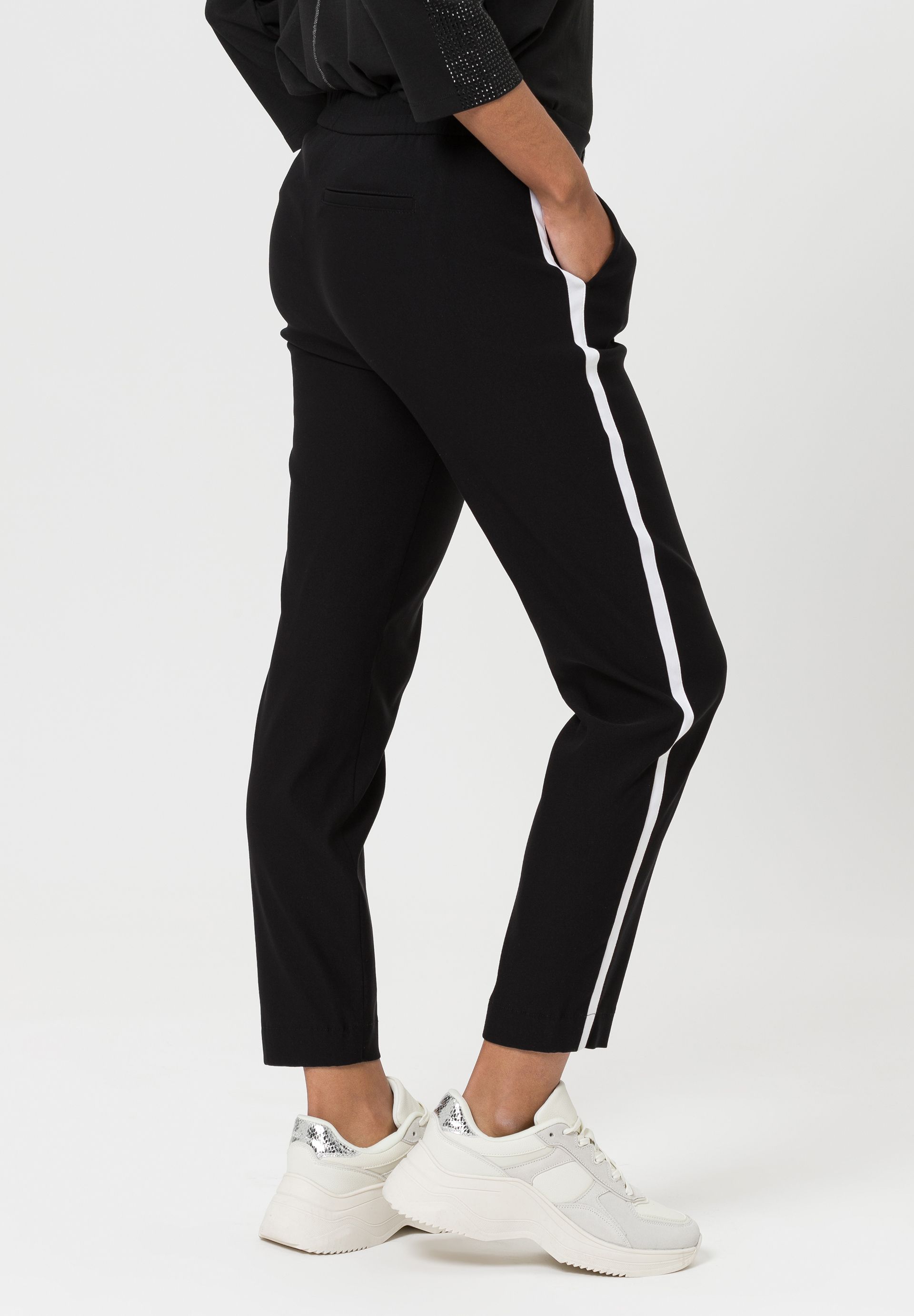 На сайте указаны российские размеры. Спортивные брюки с эластичным поясом с пуговицей, потайной молнией и боковыми карманами. Крой создает красивый силуэт. Контрастные полоски по бокам расставляют модные акценты.