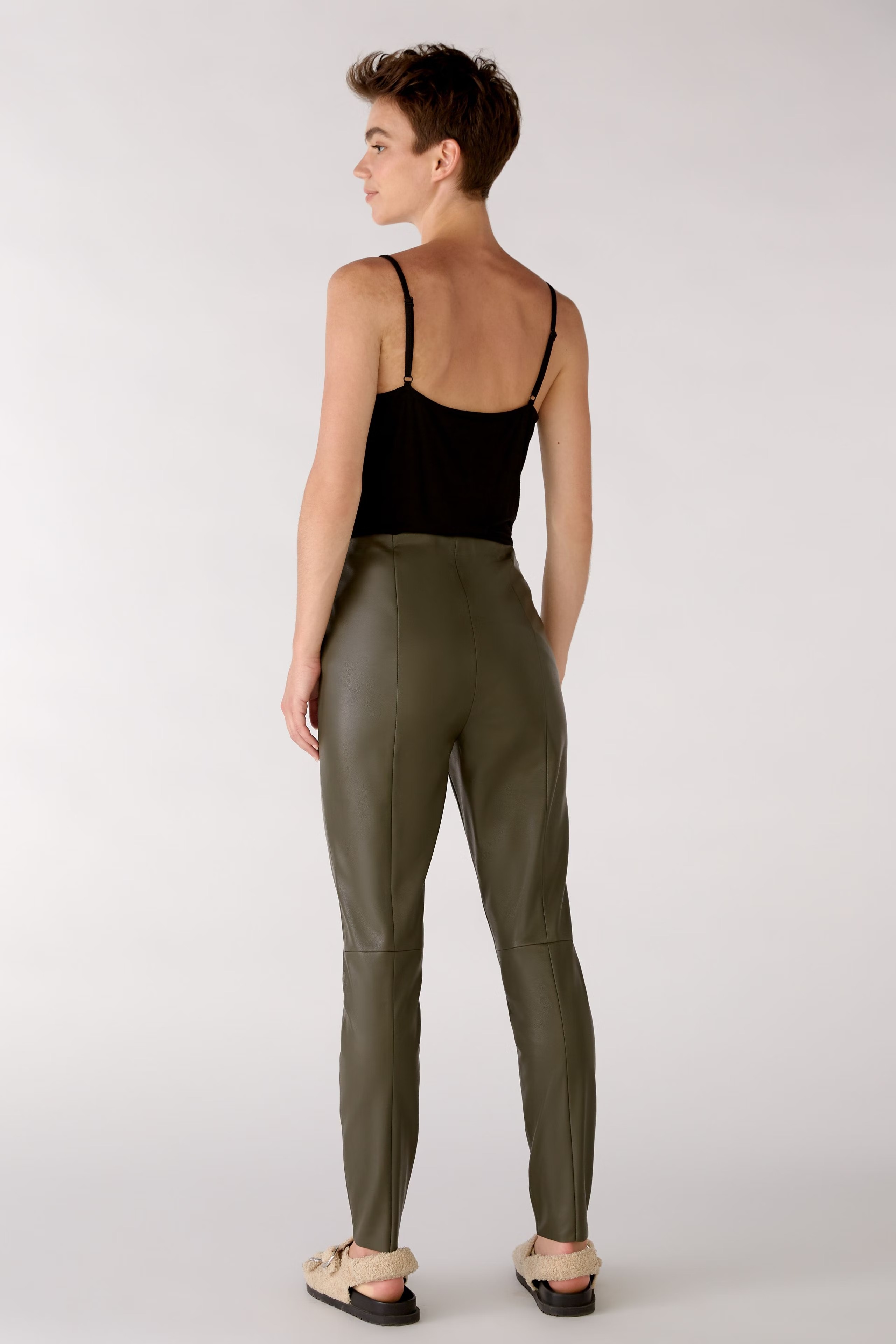 На сайте указаны российские размеры. Очень мягкая эластичная искусственная кожа. Удобный фасон без застежек благодаря эластичному поясу. Средняя талия и стандартная длина. Декоративные швы на коленях и спине. Без карманов. Рост модели 178 см