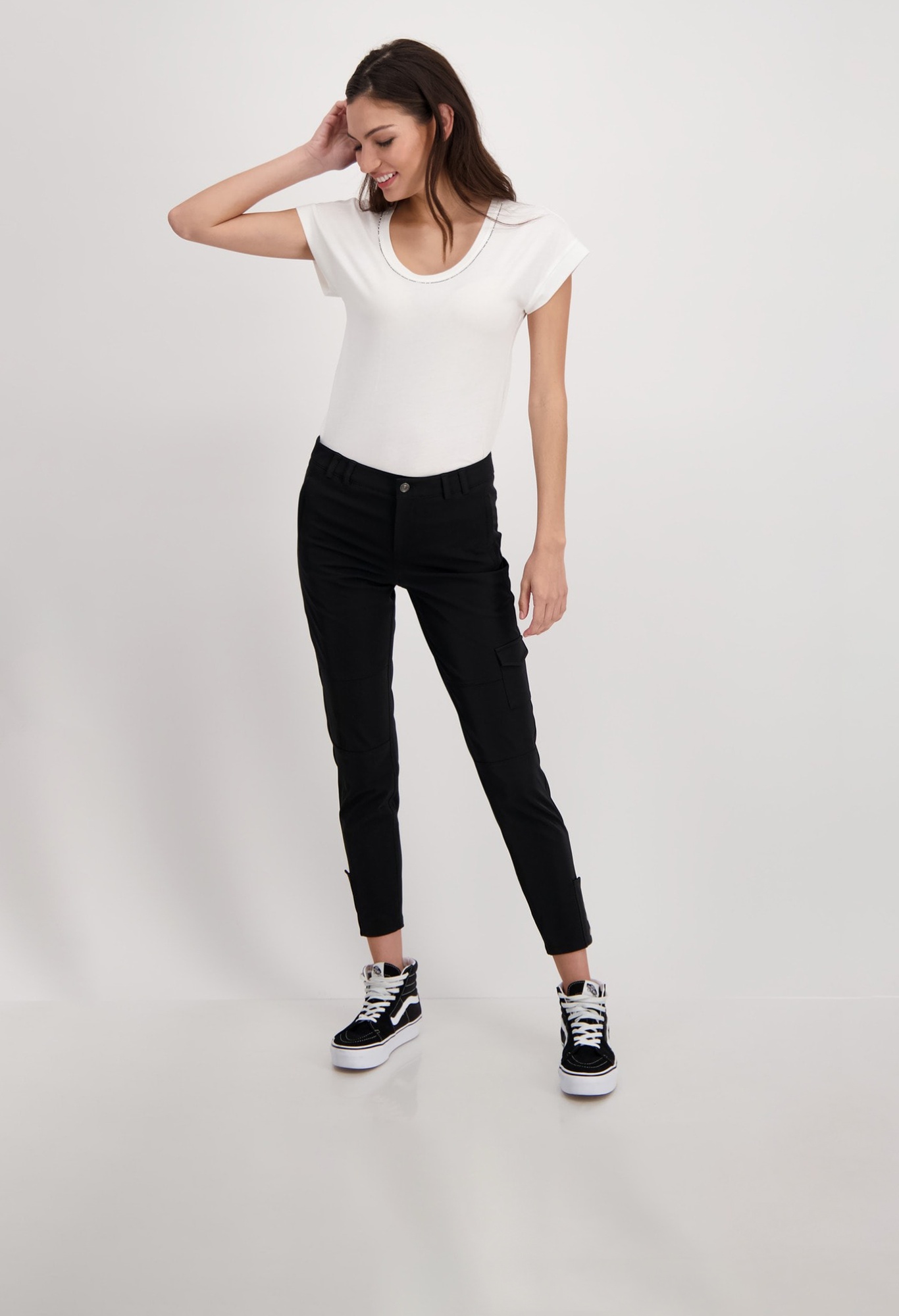 На сайте указаны российские размеры. Черные брюки с подворотами зауженного кроя. Чрезвычайно эластичное и простое в уходе качество. Благодаря высокому содержанию эластана в штанах так же легко двигаться, как и в спортивных штанах. Прямой пояс с петлями для ремня, пуговицей и потайной молнией. Передняя часть имеет боковые прорезные карманы со потайной молнией, горизонтальные и вертикальные разделительные швы и накладной карман с клапаном на уровне колена. Разрез со вставкой и декоративная планка на кнопках украшают штанины. Рост модели 179 см