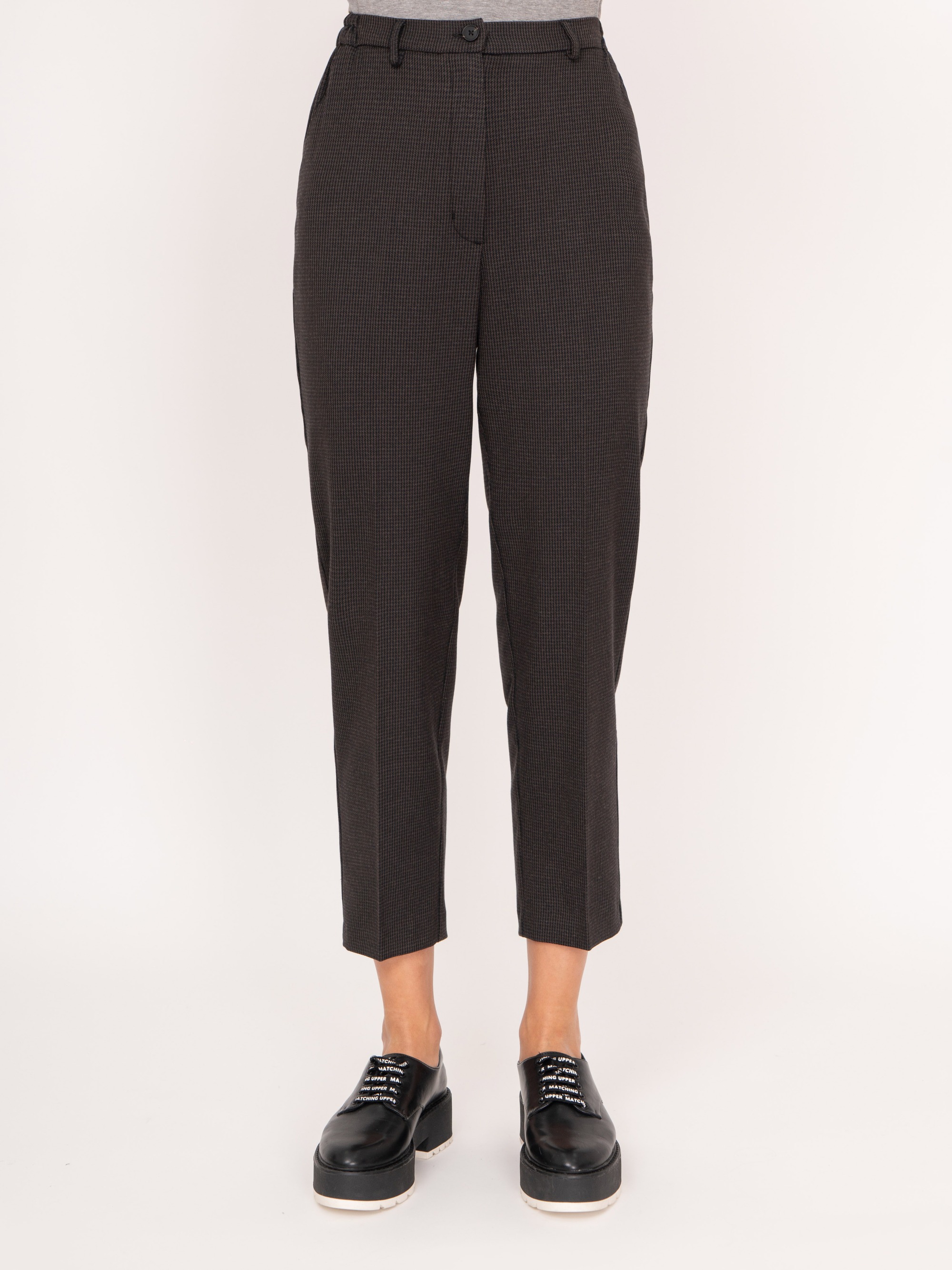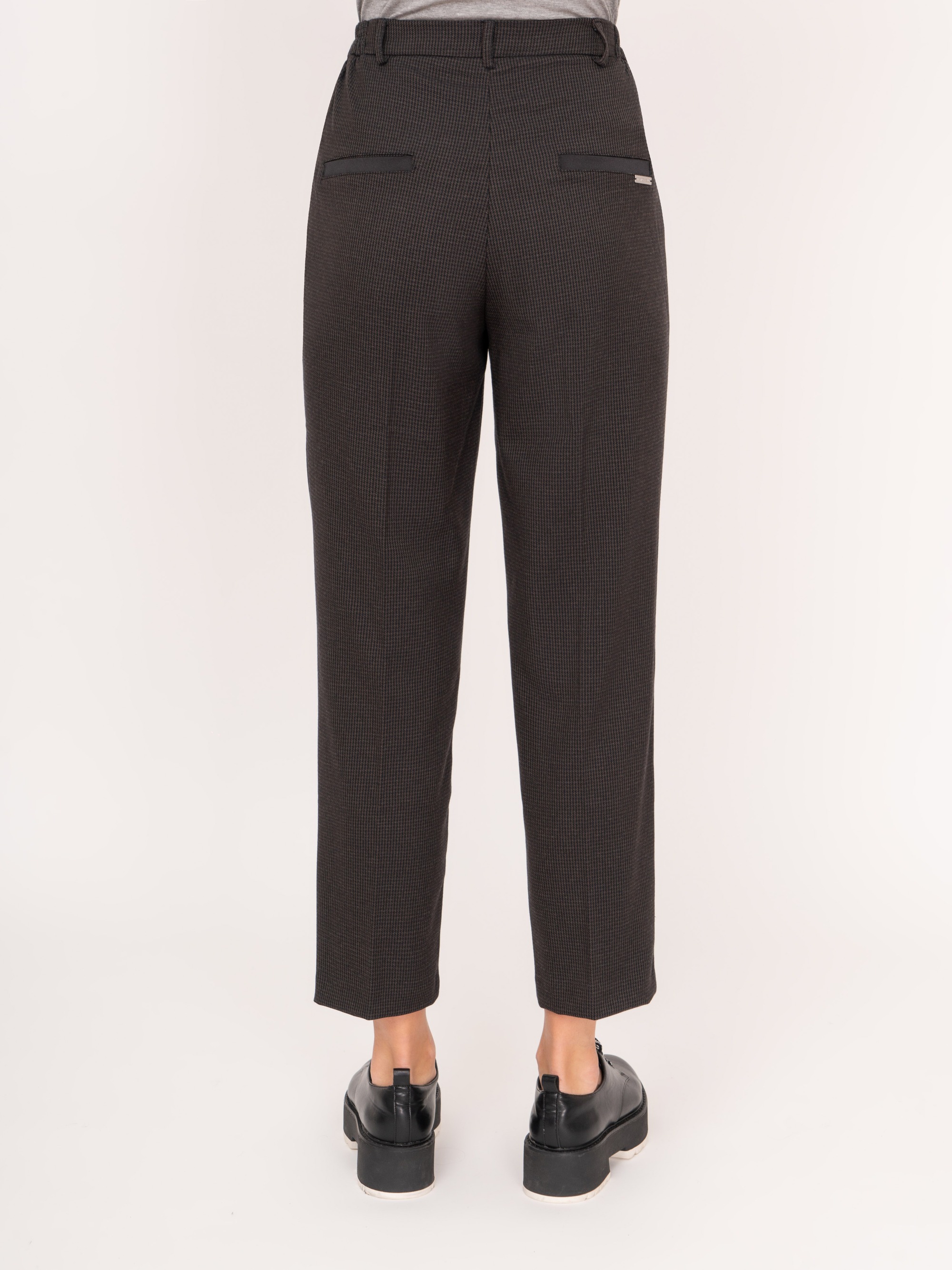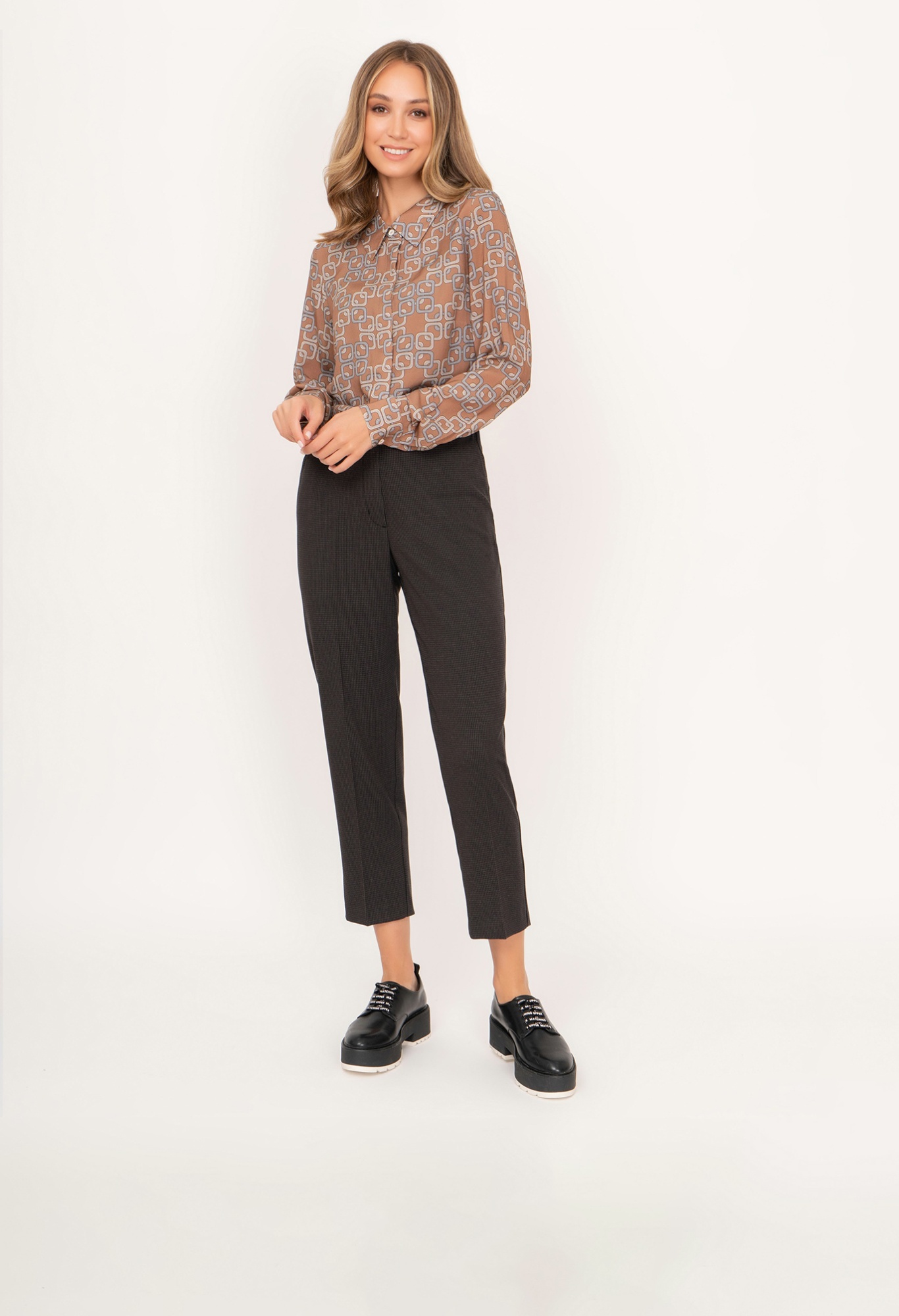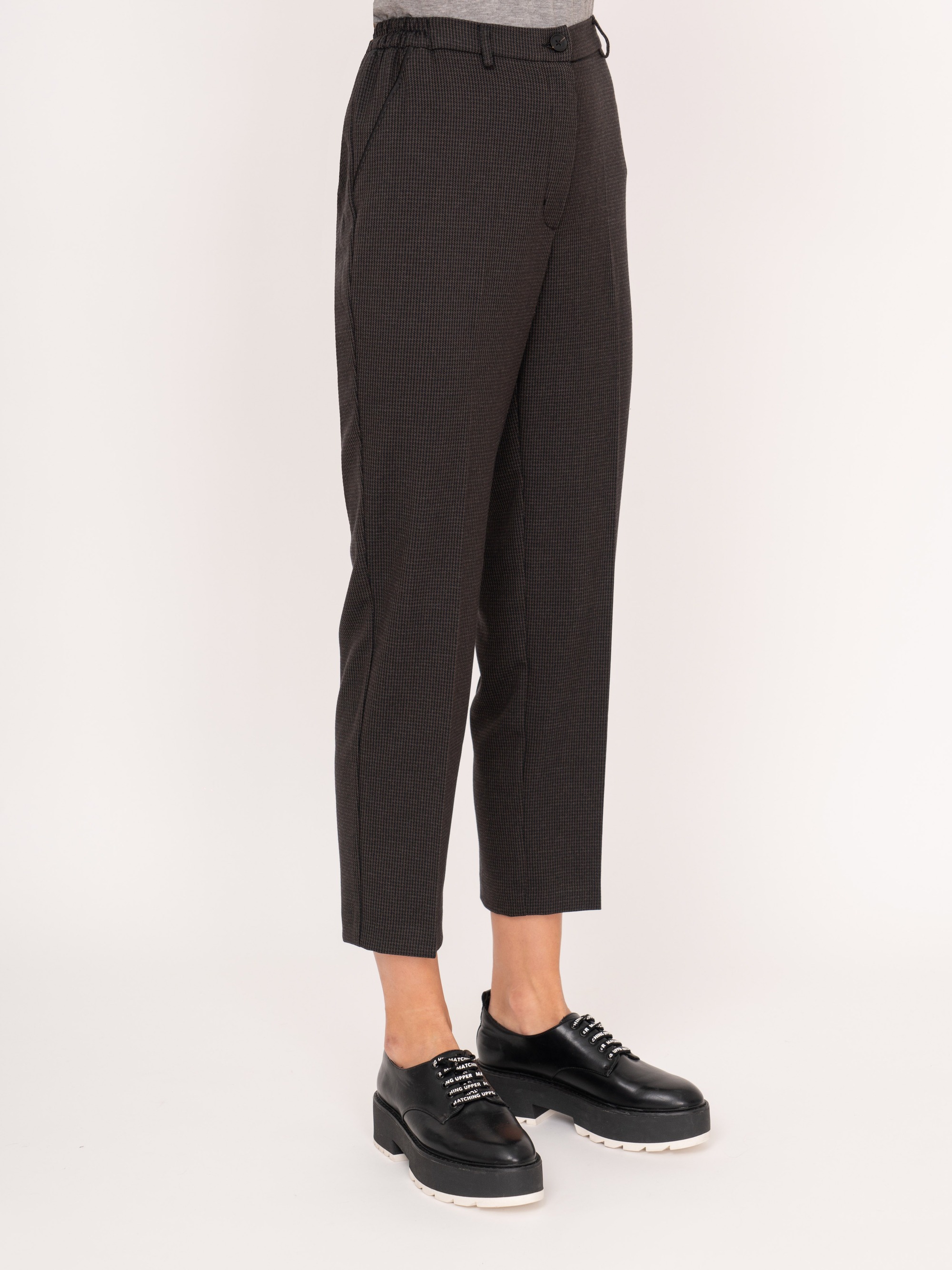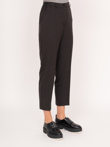 На сайте указаны российские размеры. Зауженные укороченные трикотажные коричневые брюки на молнии, с рисунком гусиная лапка. Идеальный офисный вариант. Рост модели: 175 см Длина брюк: 67 см.