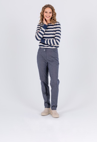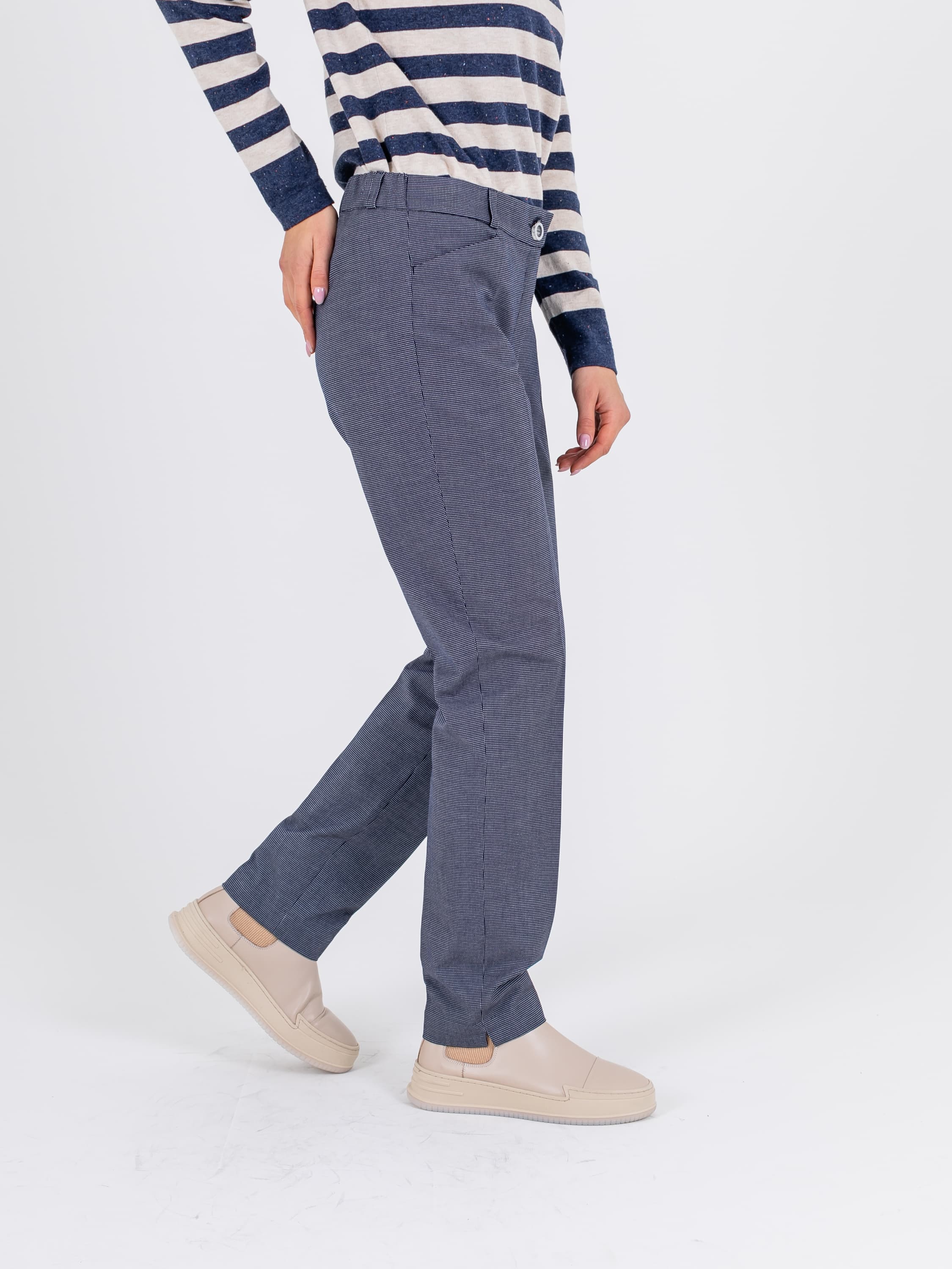 На сайте указаны российские размеры. Ткань: гладкая костюмная ткань в клетку (32% вискоза, 62% полиэстер, 6% эластан) Крой: брюки прямого силуэта с высокой линией талии. Имеют стрелку, которая создает дополнительную вертикаль и делает образ законченным. Модель выделяется оригинальными горизонтальными квадратными карманами, не уступающими по функциональности стандартным. Застегиваются на молнию и пуговицу. Отделка: в задней части на поясе создается легкая сборка. Разрезы в области щиколоток добавляют комфорта при движении. Рост модели: 175 см.