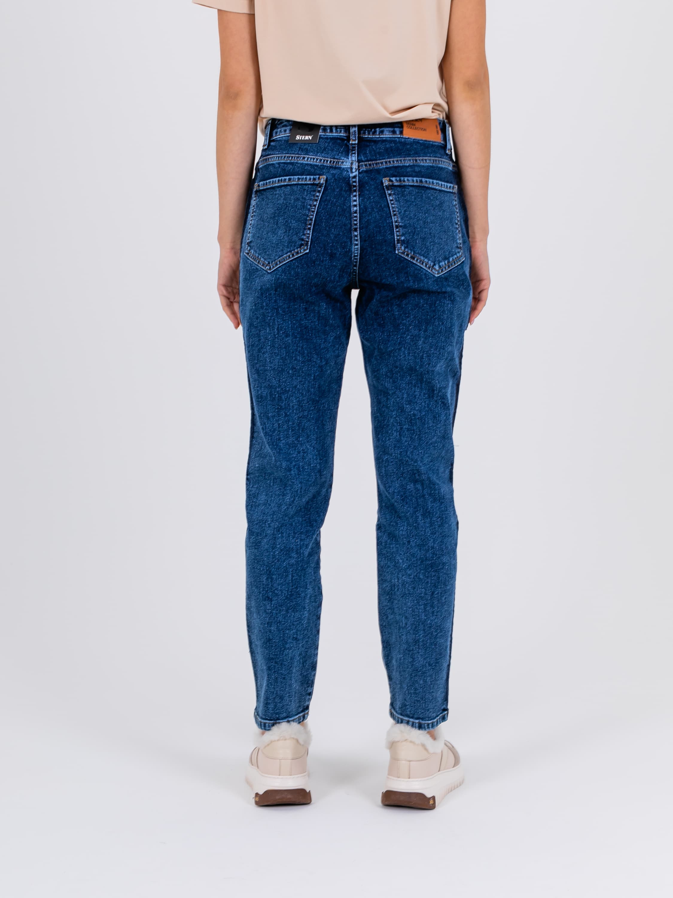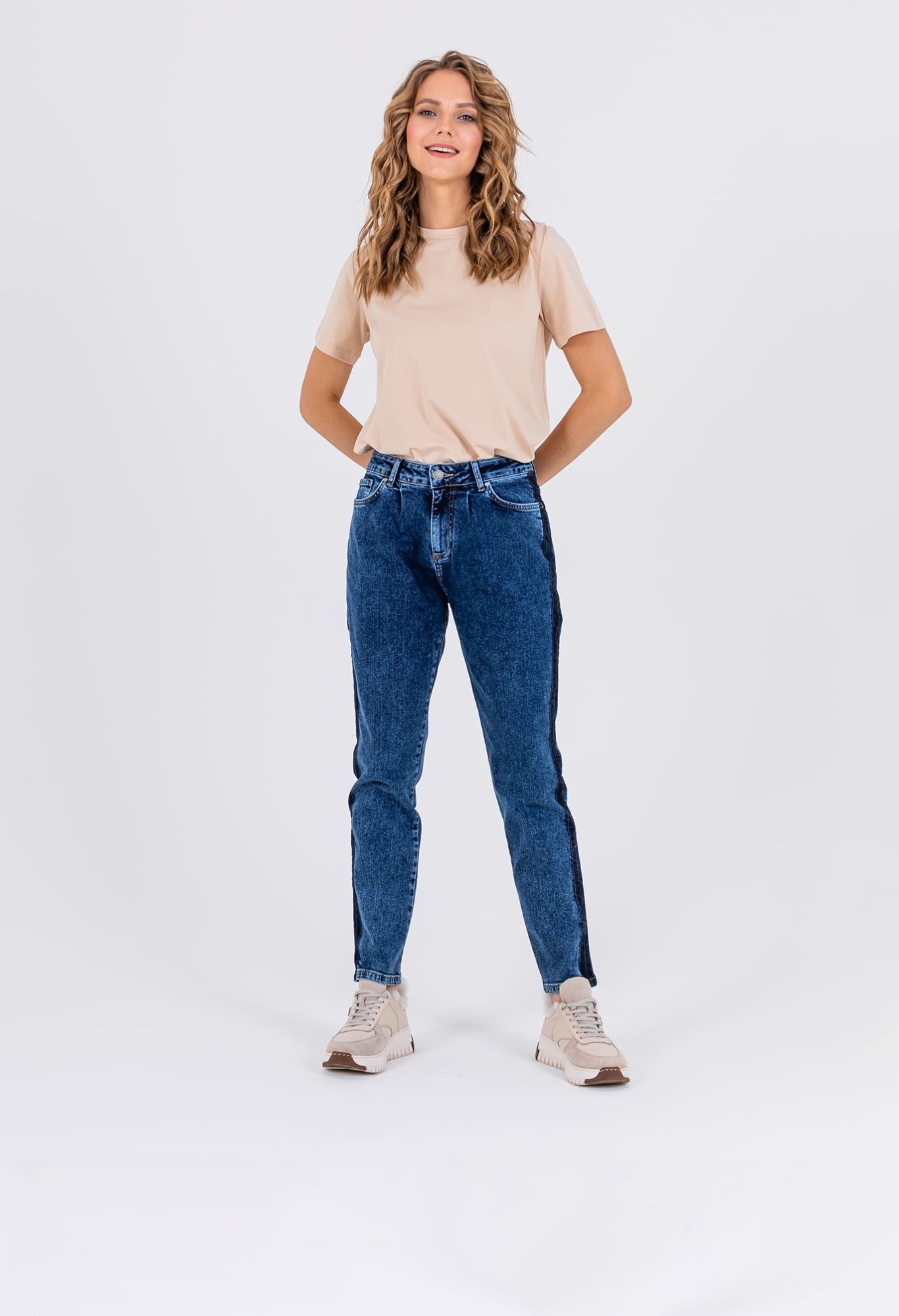На сайте указаны российские размеры. Классические джинсы MOM c интересной затемненной полоской по внешнему бокововому шву модели. Рост модели 175 см.