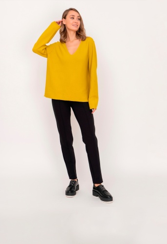 На сайте указаны российские размеры. Зауженные текстильные черные брюки на молнии без карманов, с акцентными швами спереди. Рост модели: 175 см. Длина брюк: 81 см.