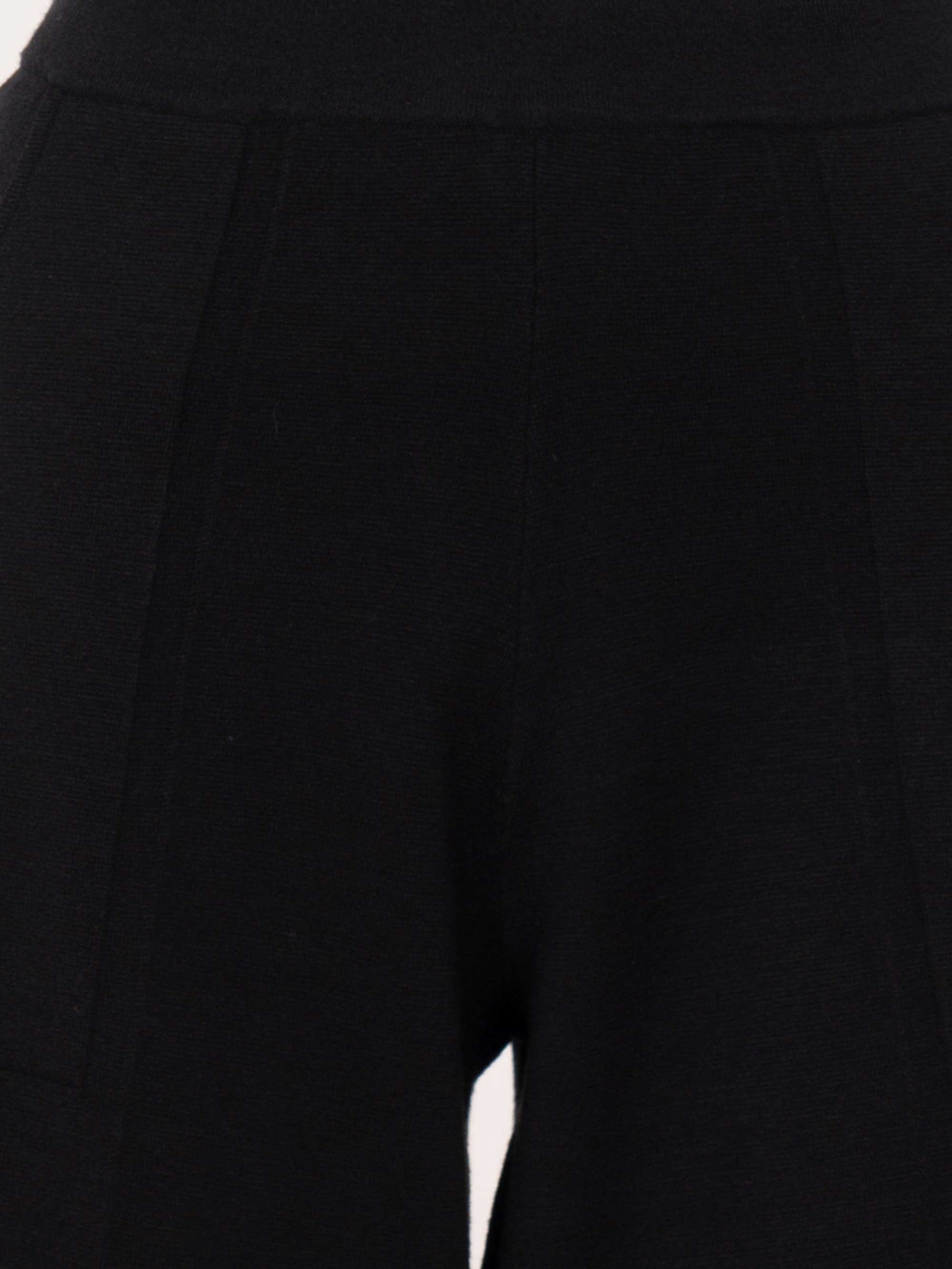 На сайте указаны российские размеры. Трикотажные черные укороченные широкие брюки на резинке, с накладными карманами. Рост модели: 175 см. Длина брюк: 60 см.