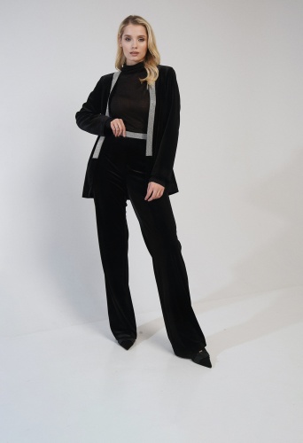 На сайте указаны российские размеры. Расклешенные бархатные брюки с высоким поясом. Украшена модель стразами и поясе. Застежка-молния. Идеально с бархатным жакетом от NISSA (арт. S11909)