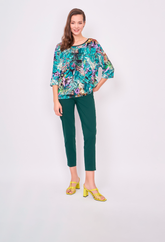 На сайте указаны российские размеры. Хлопковые зауженные темно-зеленые брюки на резинке, без карманов. Длина брюк: 71 см. Рост модели: 177 см.