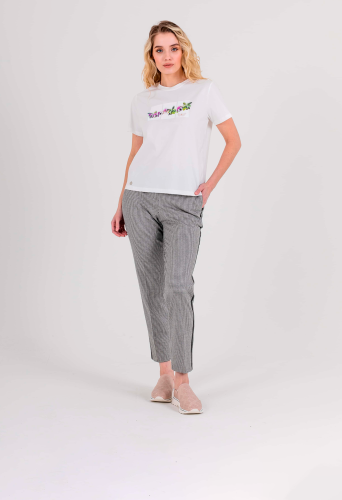 Прямые брюки с завышенной талией длиной до щиколотки с застежкой на молнию и 1 пуговицу, дизайнерская особенность модели – принт «клетка» и лампасы в боковых швах. Брюки слегка зауженные книзу. На передних половинках расположены два кармана с отрезным бочком. На задних половинках два прорезных кармана с листочками. Верх брюк обработан поясом на резинке со шлевками.