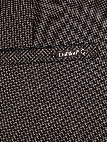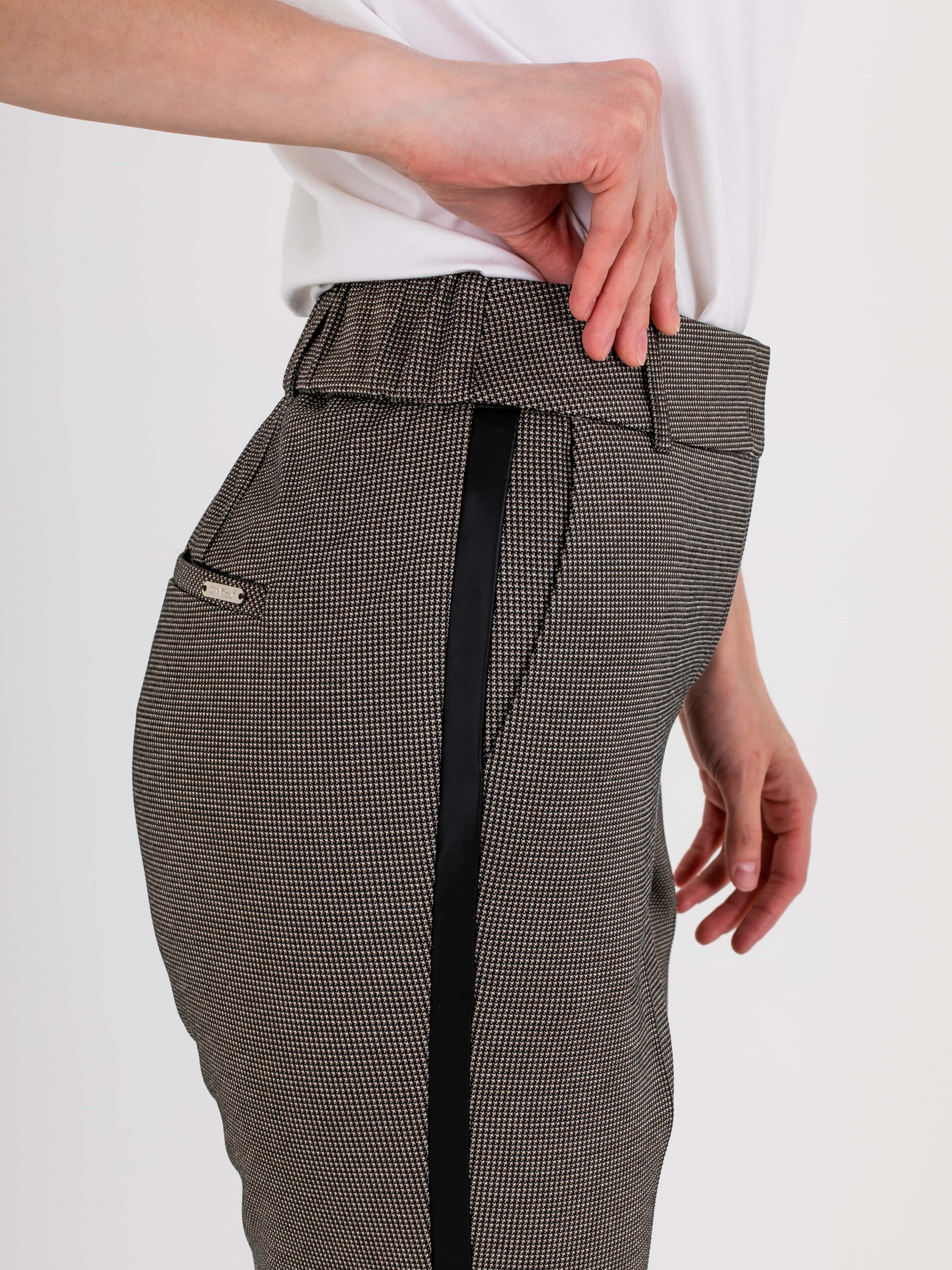 Прямые брюки с завышенной талией длиной до щиколотки с застежкой на молнию и 1 пуговицу, дизайнерская особенность модели – принт «клетка» и лампасы в боковых швах. Брюки слегка зауженные книзу. На передних половинках расположены два кармана с отрезным бочком. На задних половинках два прорезных кармана с листочками. Верх брюк обработан поясом на резинке со шлевками.