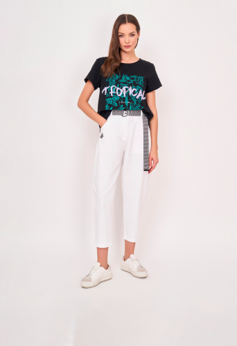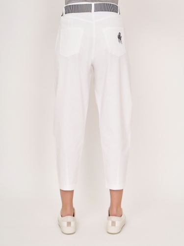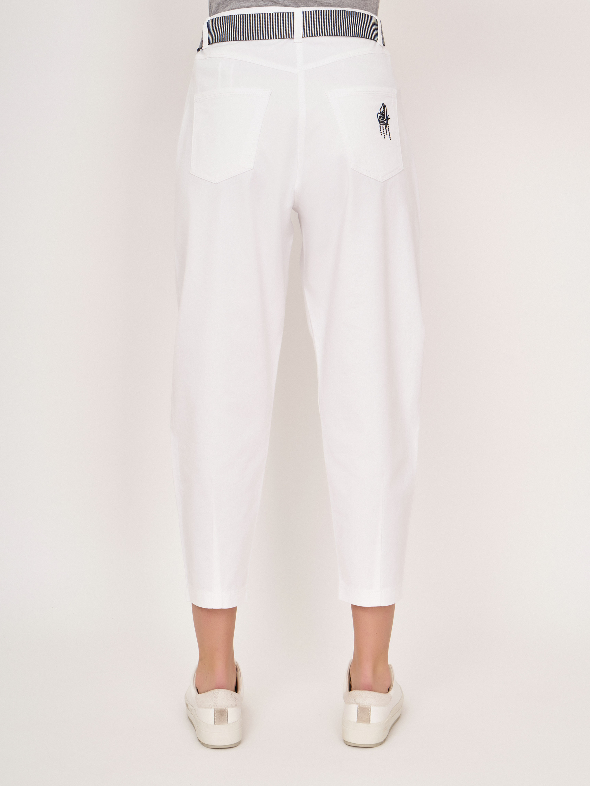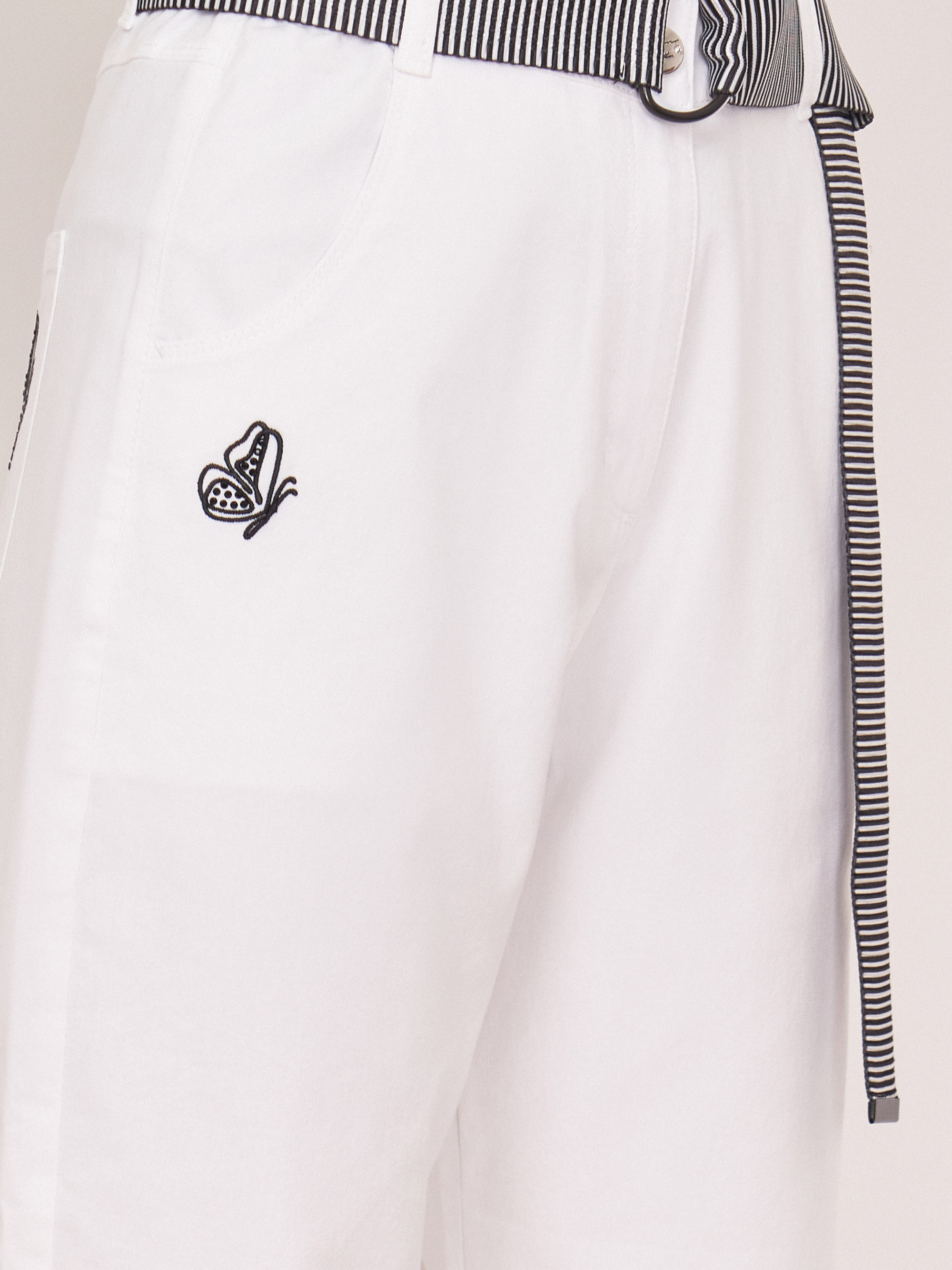 На сайте указаны российские размеры. Зауженные белые брюки бойфренды на молнии, с косыми и накладными карманами, с текстильным поясом, с рисунком бабочка. Длина брюк: 66 см. Рост модели: 177 см.