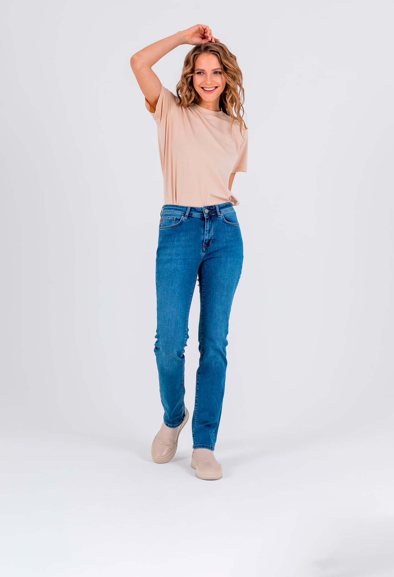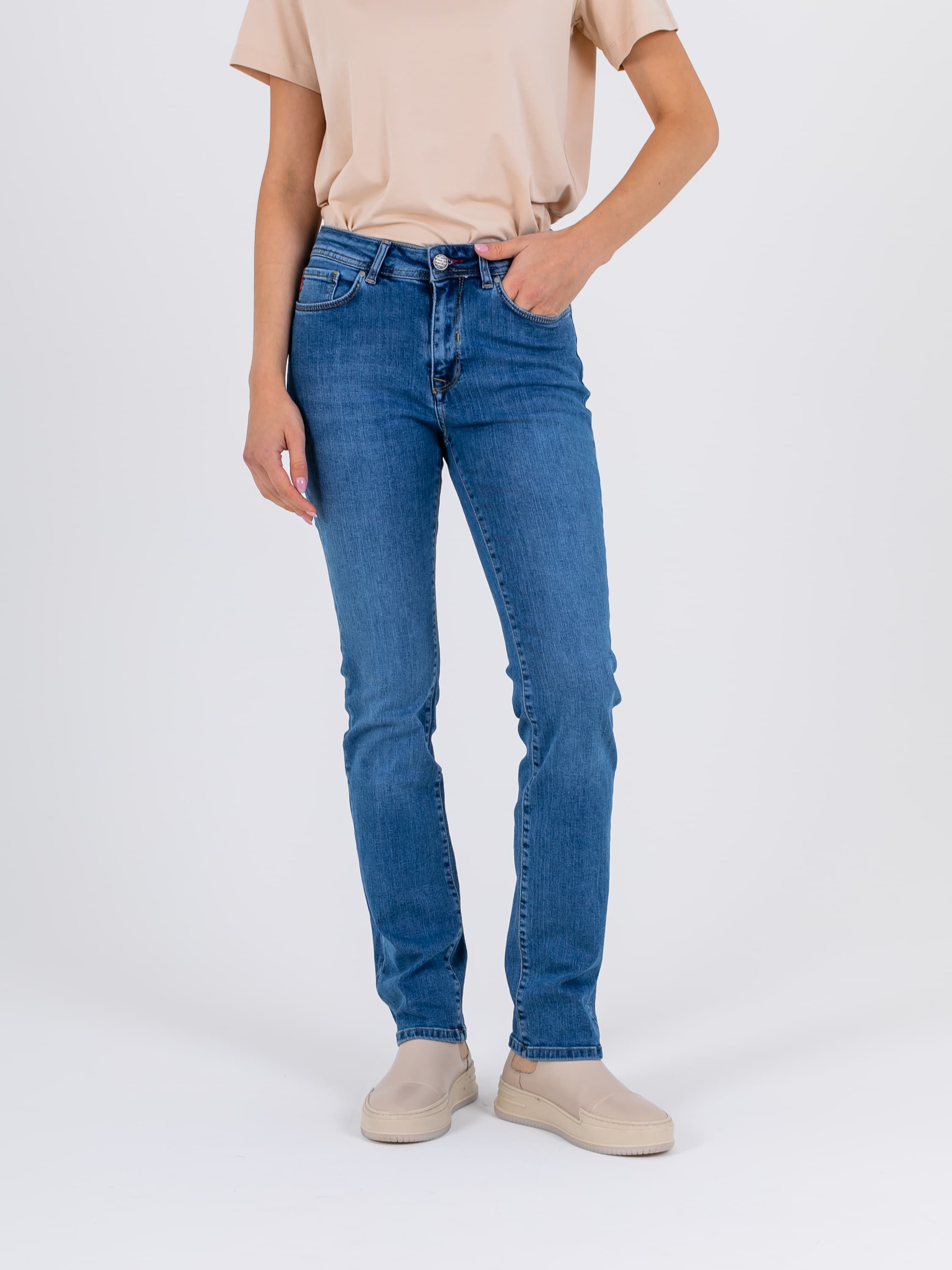 Длинные джинсы «Slim Fit» с застежкой на молнию и 1 пуговицу. Джинсы слегка зауженные книзу, с легким варёным эффектом. На передних половинках расположены два кармана с отрезным бочком и один монетный карман. На задних половинках два накладных кармана с декоративными горизонтальными швами и фигурная кокетка. Верх брюк обработан поясом со шлевками.