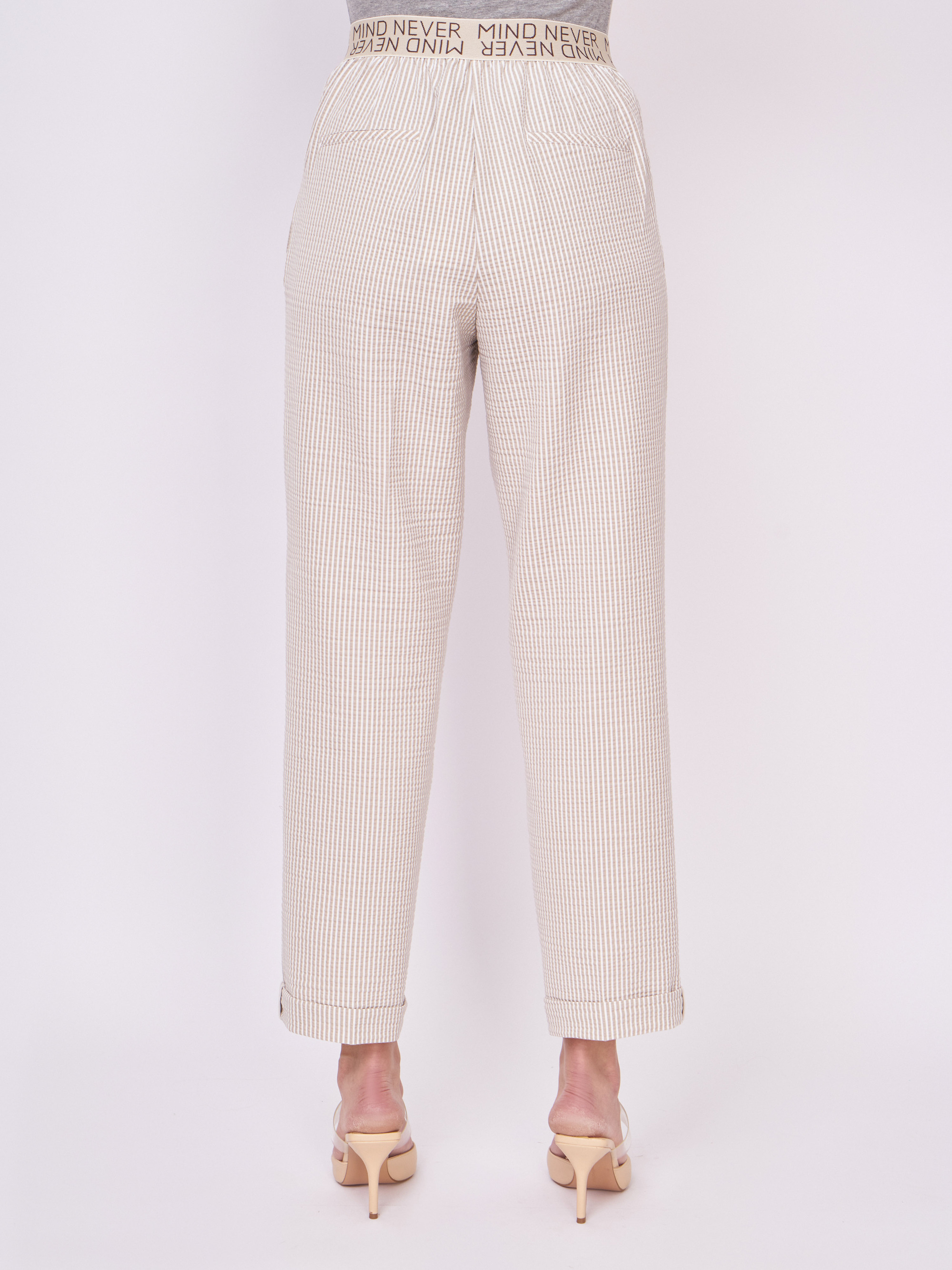 На сайте указаны российские размеры. Текстильные зауженные брюки в бело-бежевую полоску на резинке, с косыми карманами, с подворотами. Длина брючин: 71 см. Рост модели: 177 см.